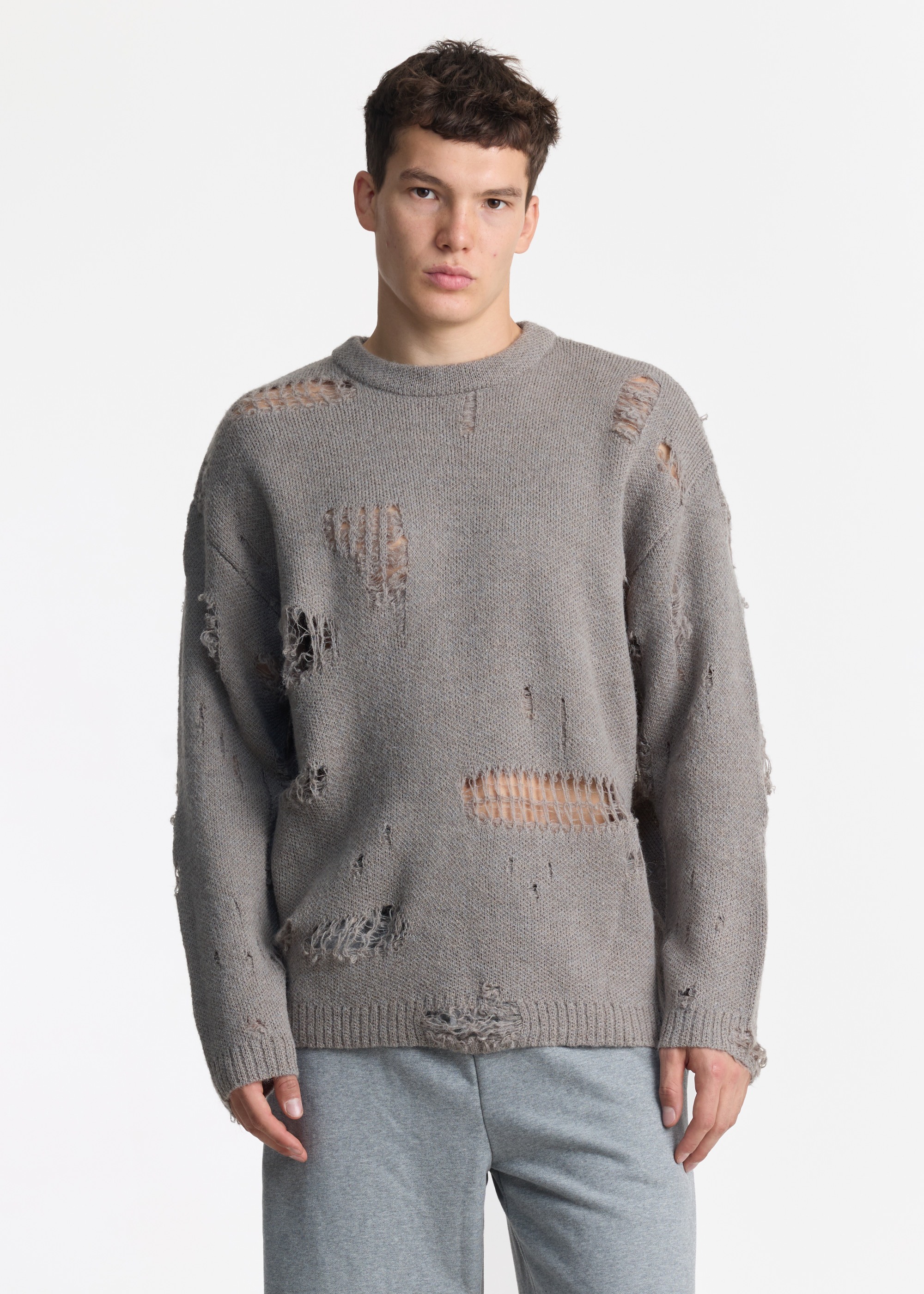 Свитер с характером и следами прошлого. Фактурная вязка и хаотичные прорехи создают эффект состаренного трикотажа — как будто вещь прожила уже не одну историю. Свободный силуэт, мягкая пряжа, «поношенный» серо-земляной оттенок и выраженные потертости на рукавах и груди — всё это превращает SCARS в эмоциональный предмет гардероба.