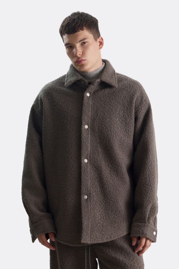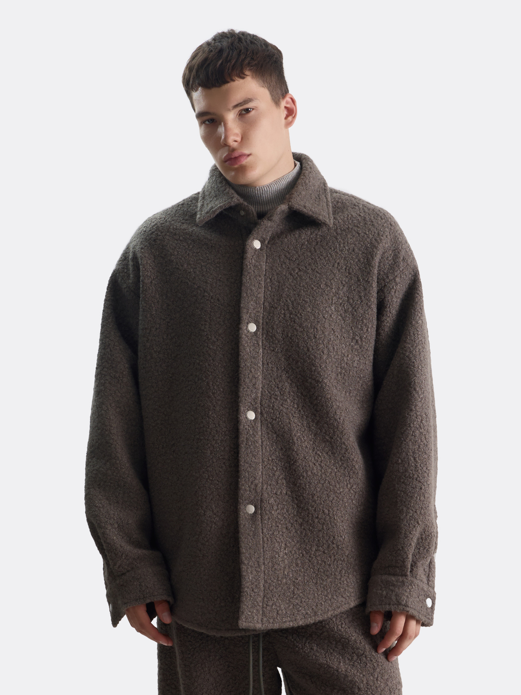 Утепленная рубашка oversize-кроя из объёмного фактурного материала с мягкой шерстяной поверхностью. Классический ворот, застёжка на кнопки и низкая линия плеч. Тёплый, уютный и визуально плотный слой, который легко заменит лёгкую куртку в прохладный день.
