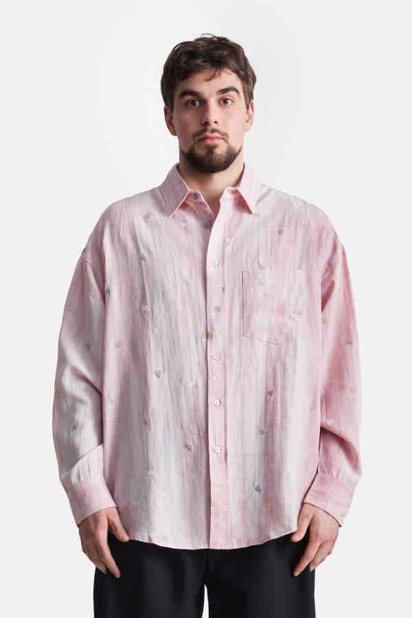 Рубашка оверсайз-кроя в нежно-розовом оттенке. Модель дополнена декоративными вышитыми цветными сердечками, которые добавляют романтичный акцент, делая изделие уникальным. Нагрудный карман с клапаном и застежка на пуговице делают рубашку не только стильной, но и функциональной. Отличный выбор для создания расслабленных и эффектных образов.