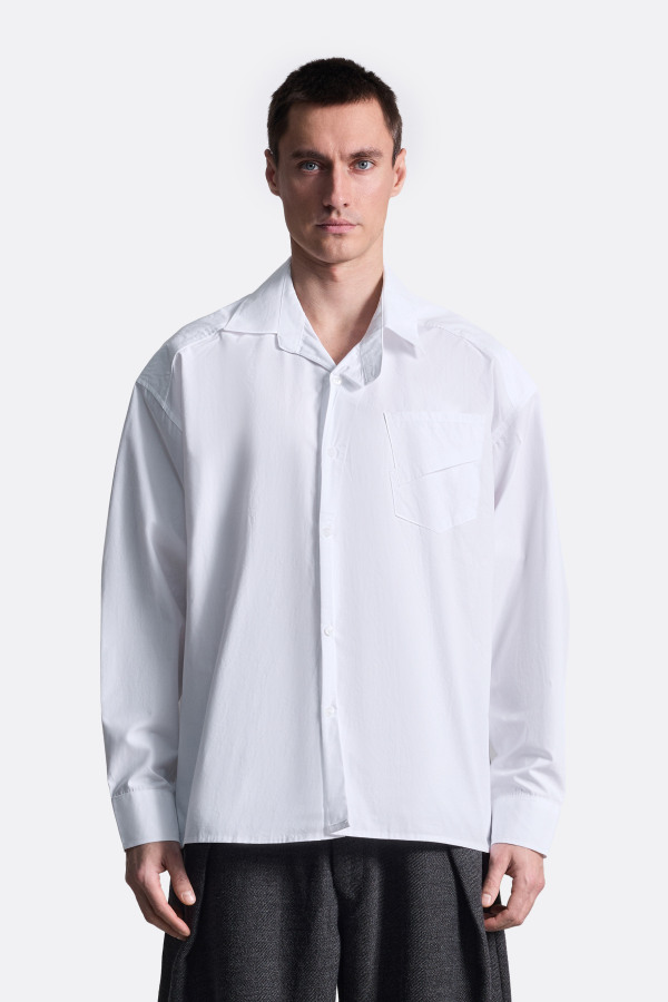 Рубашка с ассиметричной стежкой. Классический дизайн с отложным воротником, застёжкой на пуговицах и накладным двойным карманом на груди. Практичная и стильная — подойдёт как для повседневного образа, так и для более формального стиля.