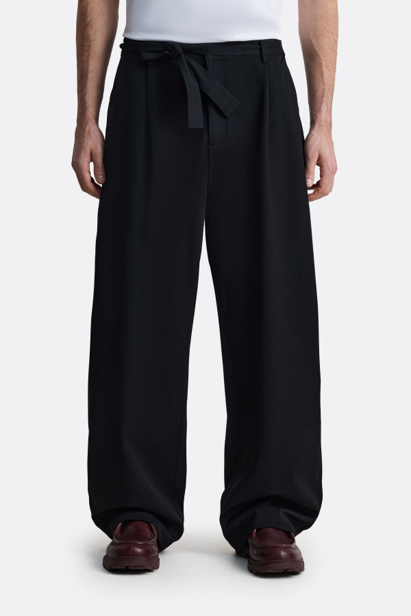 Объёмные брюки с мягкой, свободной посадкой и широкими брючинами, создающими характерный силуэт. Пояс дополнен текстильным ремнём-лентой — акцентная деталь, добавляющая образу динамику и лёгкий восточный штрих. Гладкая ткань ложится ровными плоскостями, подчёркивая чистую архитектуру кроя и выразительную линию драпировки.