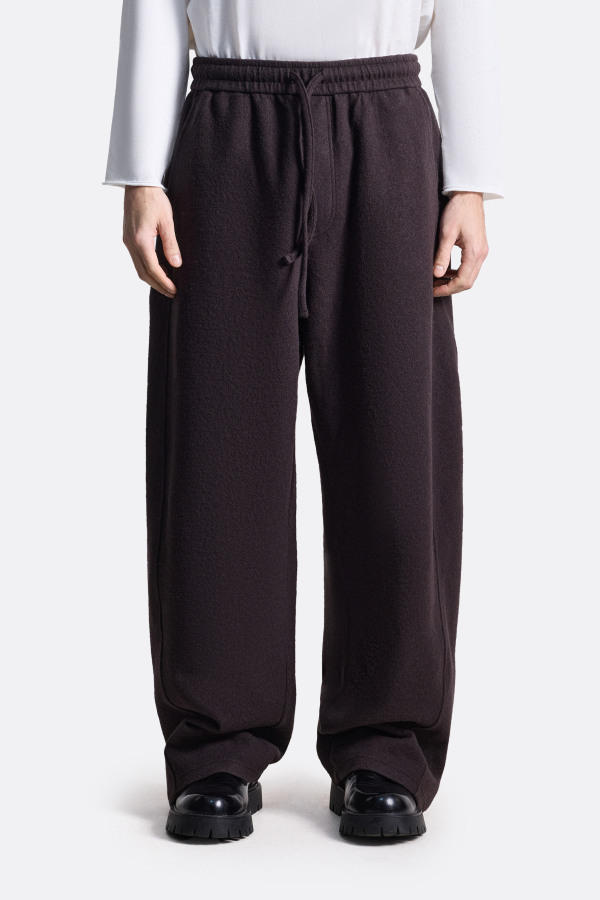 Свободные брюки, выполненные из приятного на ощупь материала на основе шерсти с лёгким ворсом. Прямой объёмный силуэт создаёт расслабленную вертикаль, а эластичный пояс добавляет комфорта и естественной посадки. Аккуратный шов вдоль штанины визуально вытягивает линию и делает образ чище. Лёгкость, тепло и минимализм — спокойная база для осенних и зимних образов.