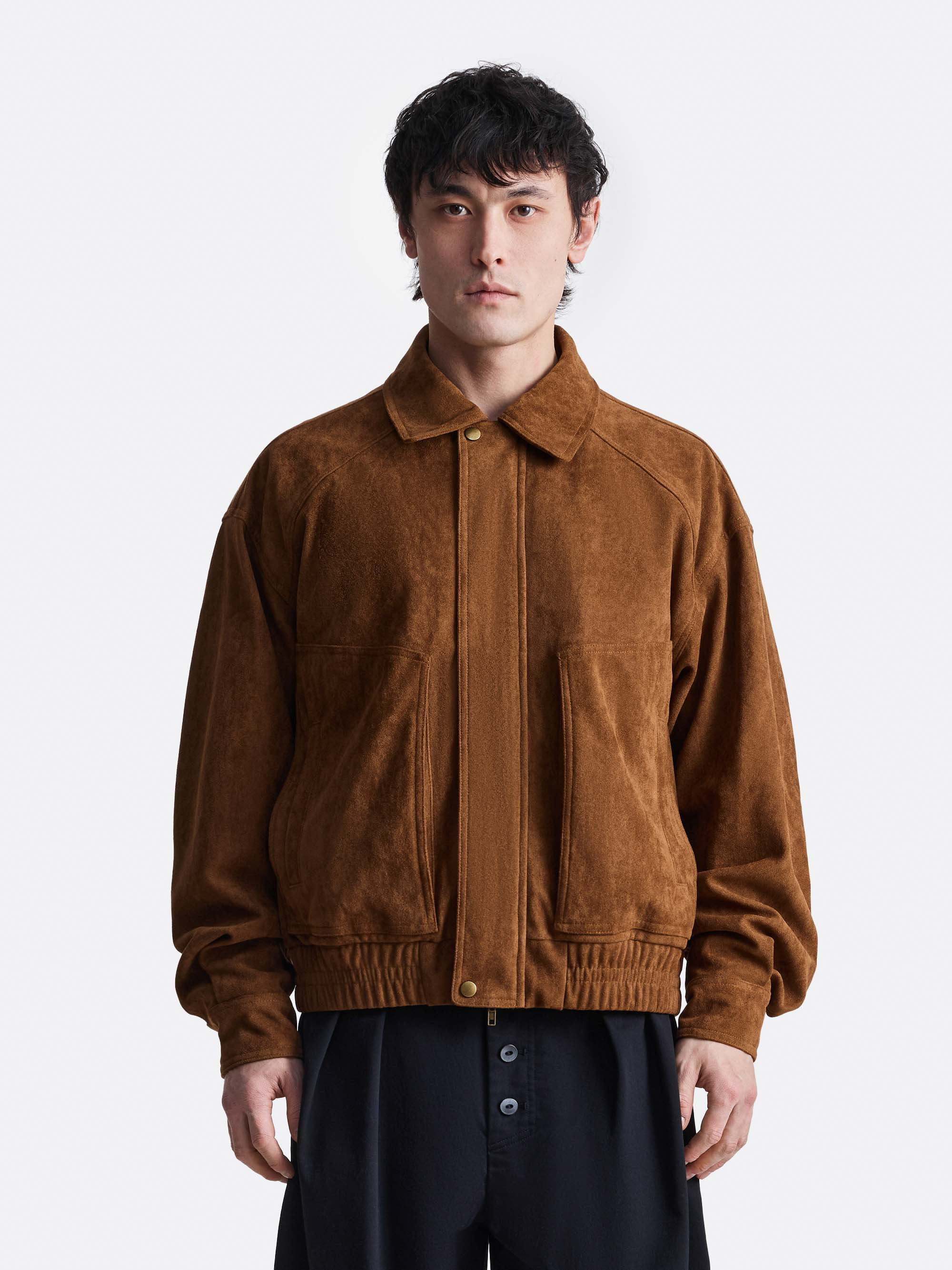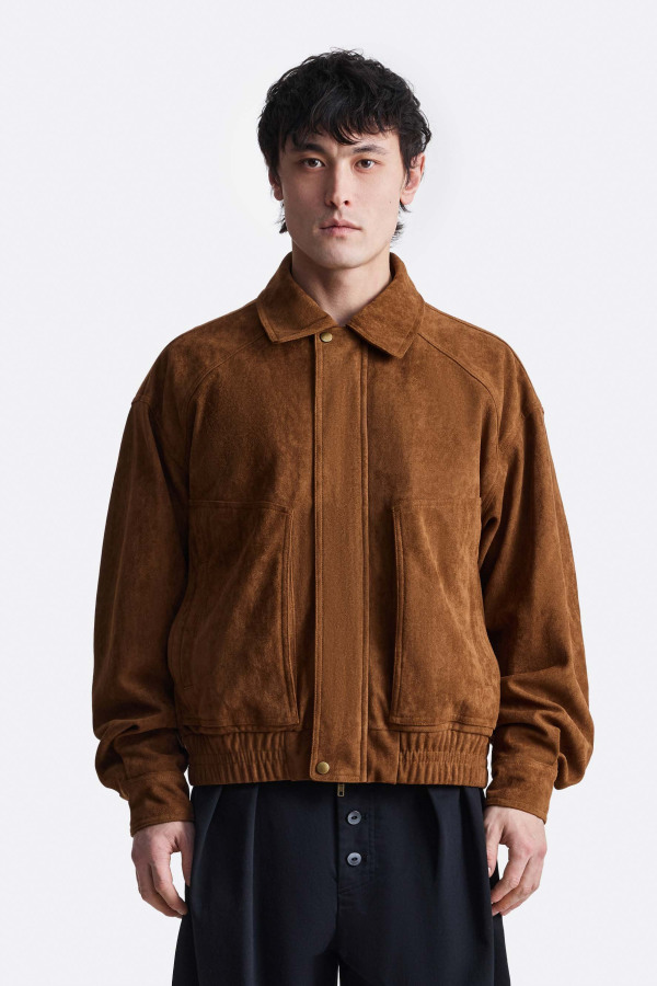 Куртка укороченного кроя выполнена из фактурного материала с бархатистой поверхностью. Спереди расположены крупные накладные карманы, подчёркивающие утилитарный характер изделия. Застёжка дополнена планкой и металлической фурнитурой, по низу — эластичная вставка, формирующая аккуратную посадку.