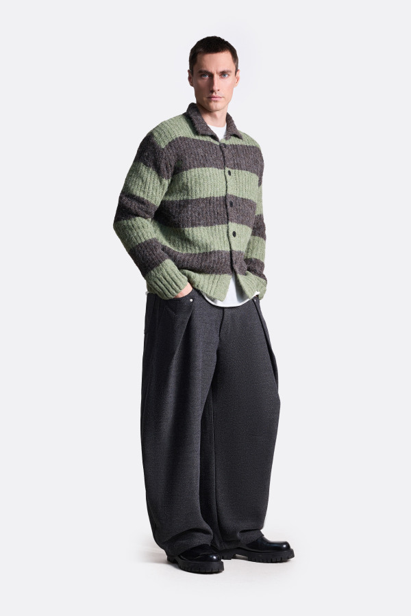 Кардиган в полоску из мягкой, фактурной пряжи. Кардиган имеет классический крой. Застёгивается на пуговицы, оснащён воротником. Отлично подойдёт для прохладных дней — сочетайте с джинсами или брюками для комфортного образа. Кардиган представлен в голубом и оливковом цветах.