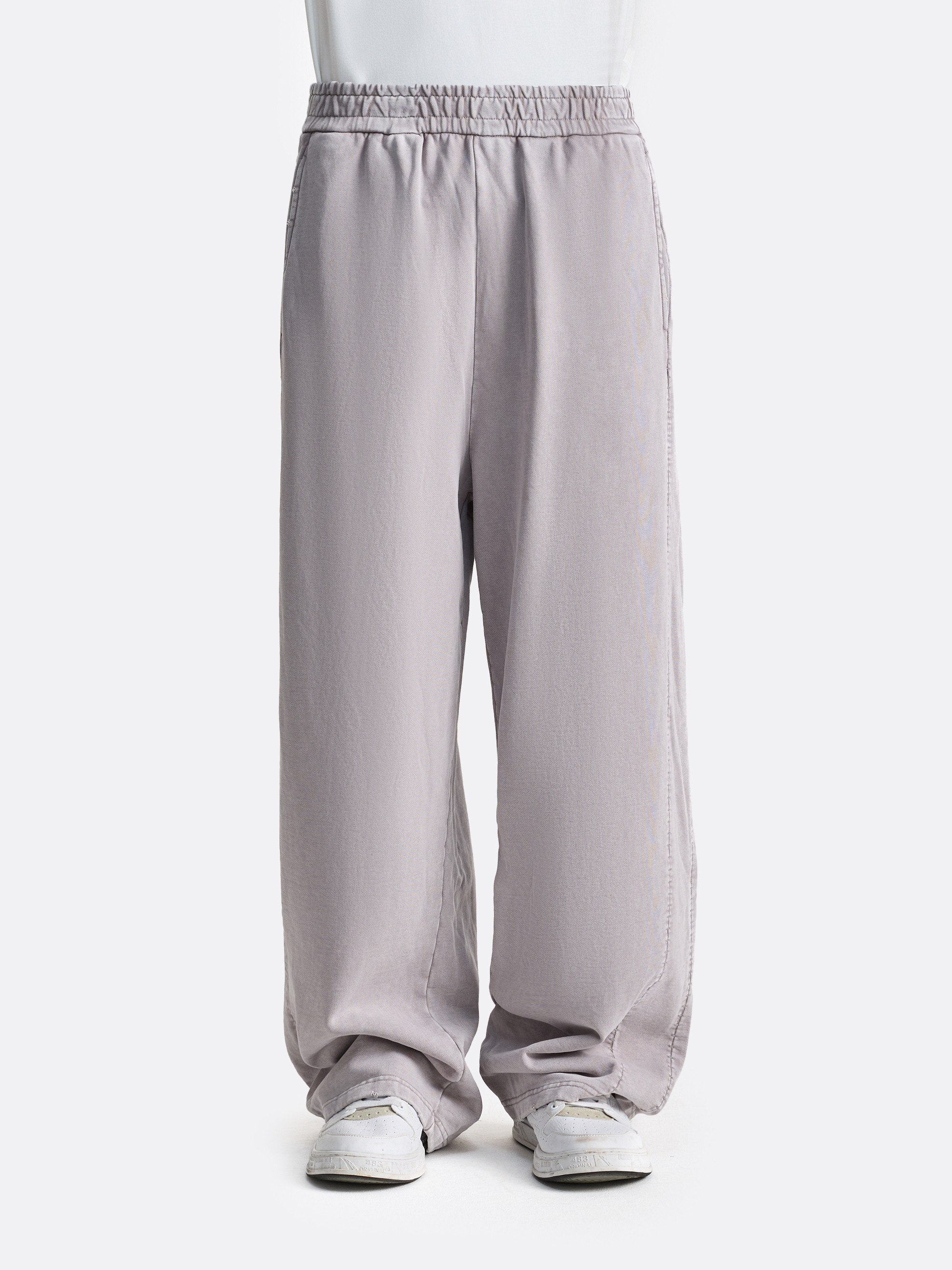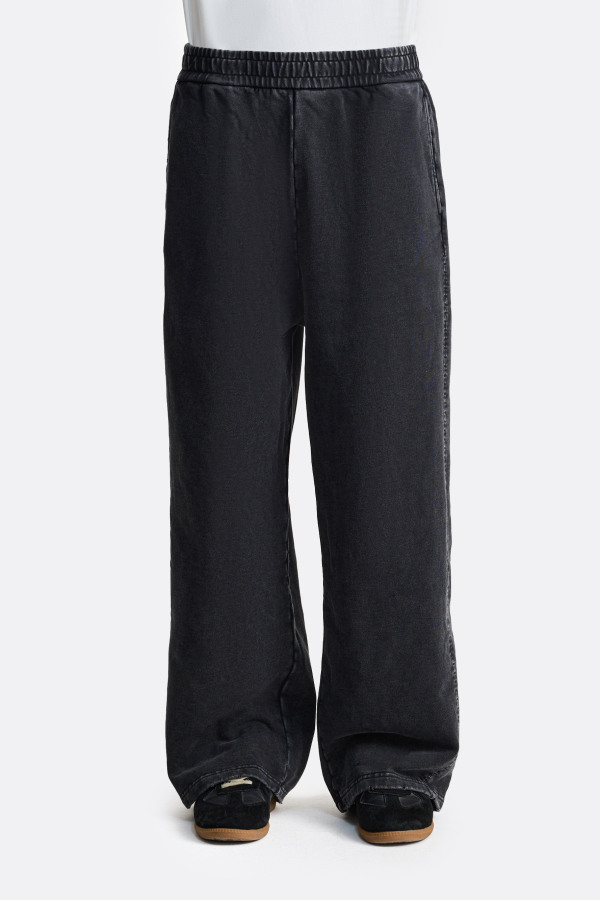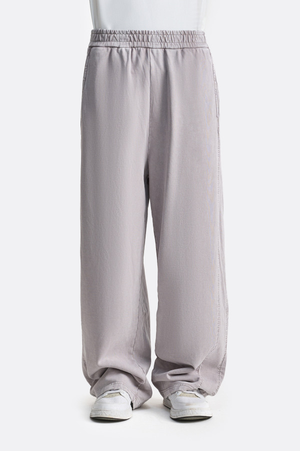Брюки свободного кроя с мягким объёмом и акцентом на деликатный выцветший эффект по всей поверхности. Ткань выглядит слегка припылённой, с естественными переходами оттенка, за счёт чего модель приобретает глубину и винтажный характер. Эластичный пояс обеспечивает комфортную посадку, а плавная линия штанин формирует расслабленный силуэт.