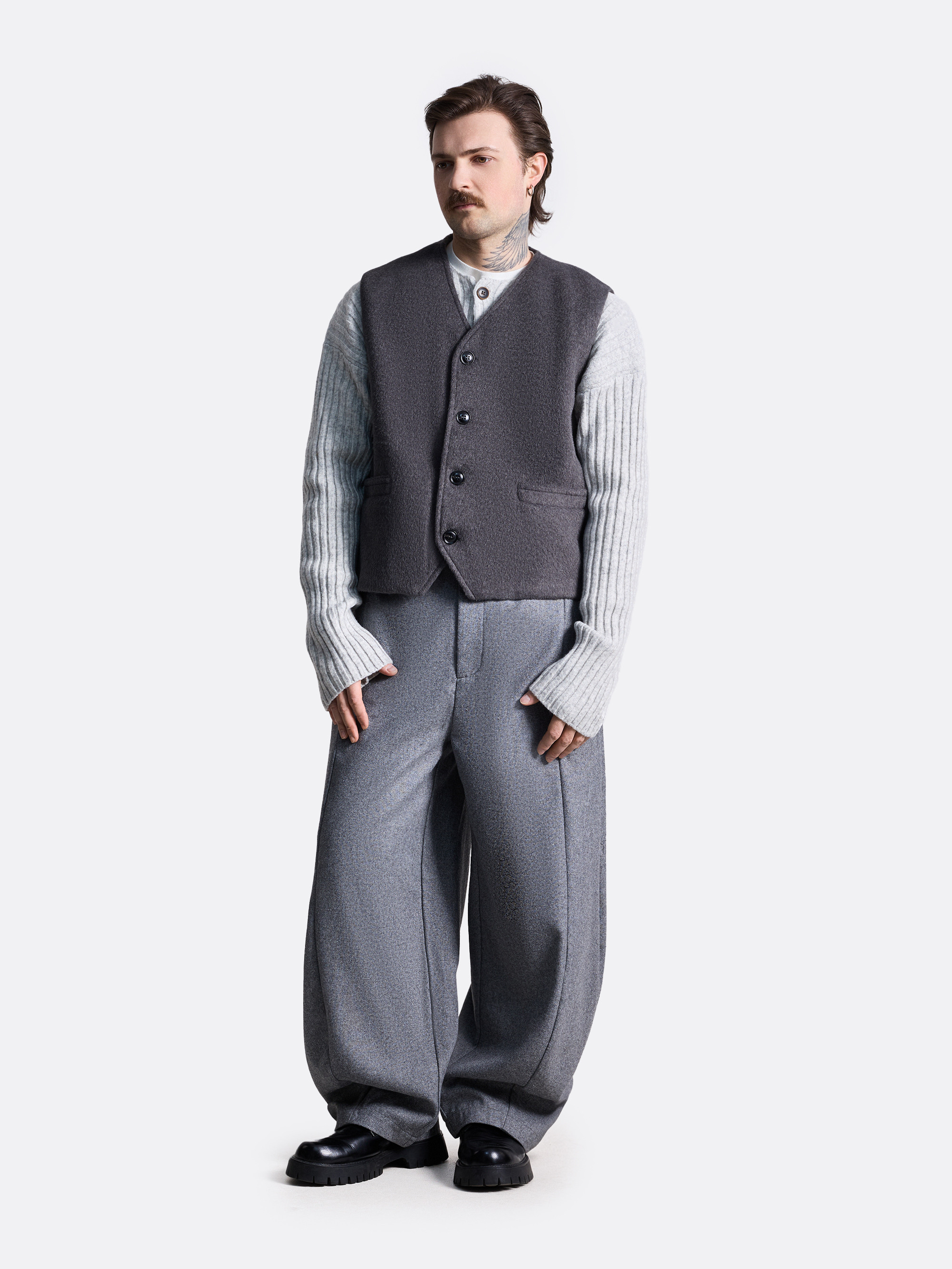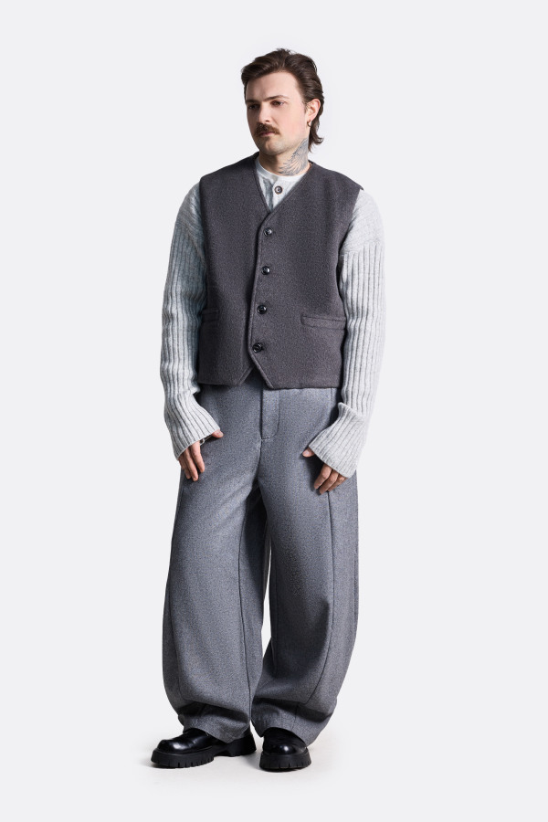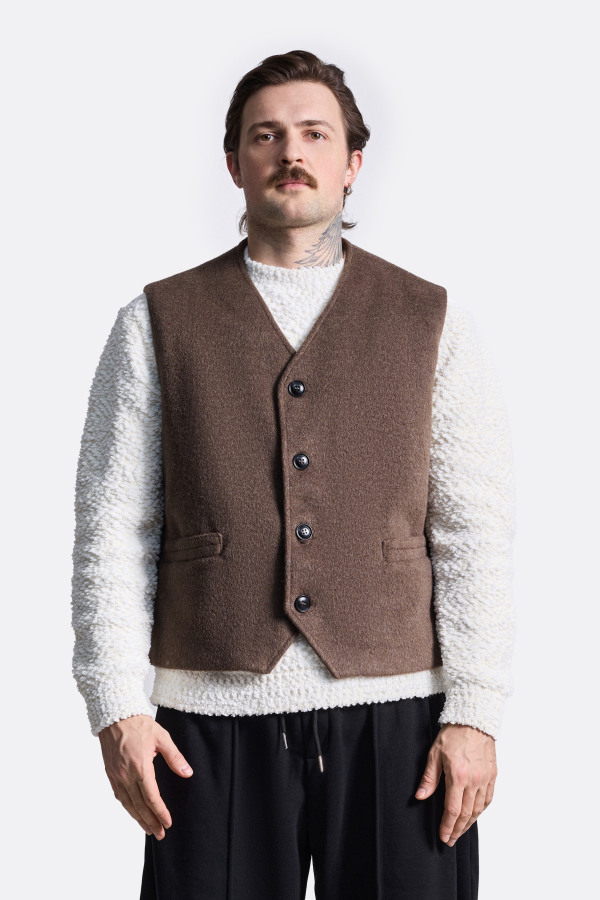 Утепленный жилет на пуговицах классического кроя с V-образным вырезом. Выполнен из плотного материала с добавлением шерсти. Имеет два накладных кармана по бокам — практично и стильно. Отлично дополняет повседневный образ, хорошо сочетается с свитерами и брюками. Уютный и лаконичный вариант для прохладных дней. Жилет представлен в коричневом и сером цветах.