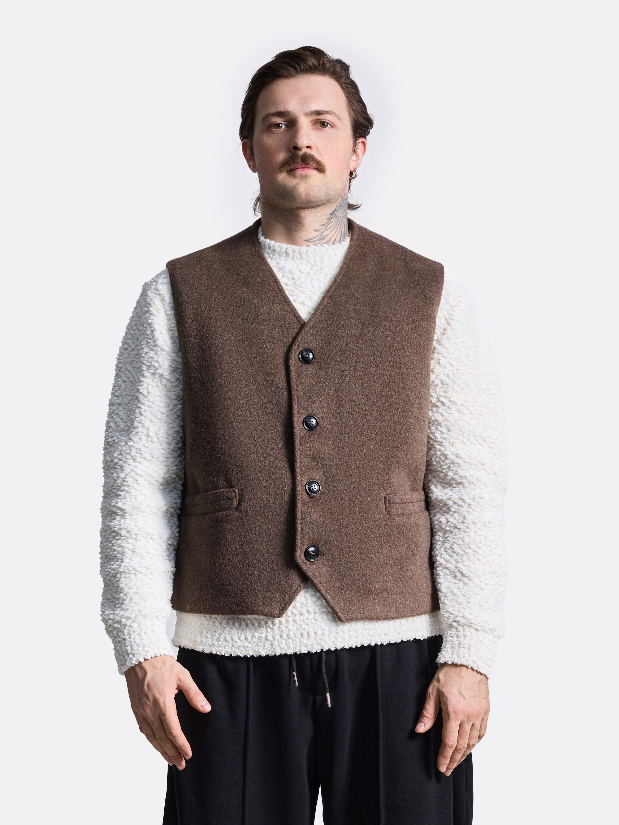 Утепленный жилет на пуговицах классического кроя с V-образным вырезом. Выполнен из плотного материала с добавлением шерсти. Имеет два накладных кармана по бокам — практично и стильно. Отлично дополняет повседневный образ, хорошо сочетается с свитерами и брюками. Уютный и лаконичный вариант для прохладных дней. Жилет представлен в коричневом и сером цветах.