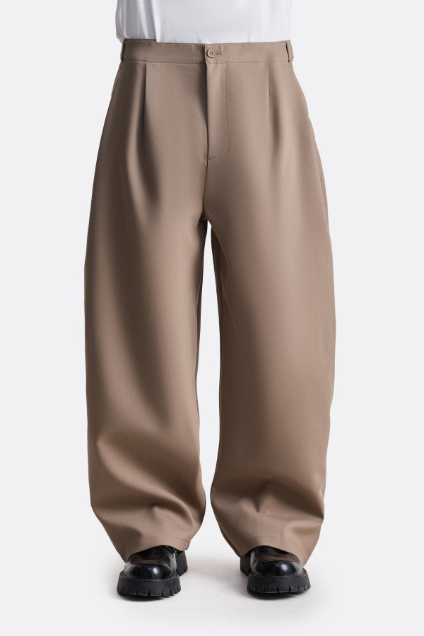 Брюки свободного силуэта с акцентом на защипы и расслабленную посадку. Глубокие складки от пояса создают выразительный объём, который усиливается за счёт плотной ткани. Слегка заниженная линия талии, классические карманы и универсальная длина — модель, в которой формальность легко сочетается с комфортом.