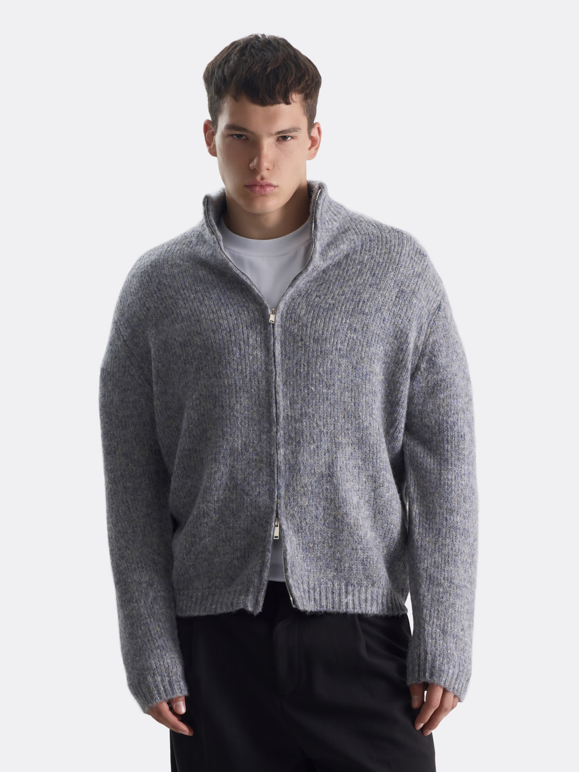 Светло-серый свитер на молнии с высоким воротом. Мягкий объём, расслабленная посадка, неброская меланжевая текстура. Выполнен из мягкой пряжи, приятной на ощупь. Двусторонняя молния добавляет удобства, а воротник можно носить как поднятым, так и отложенным.