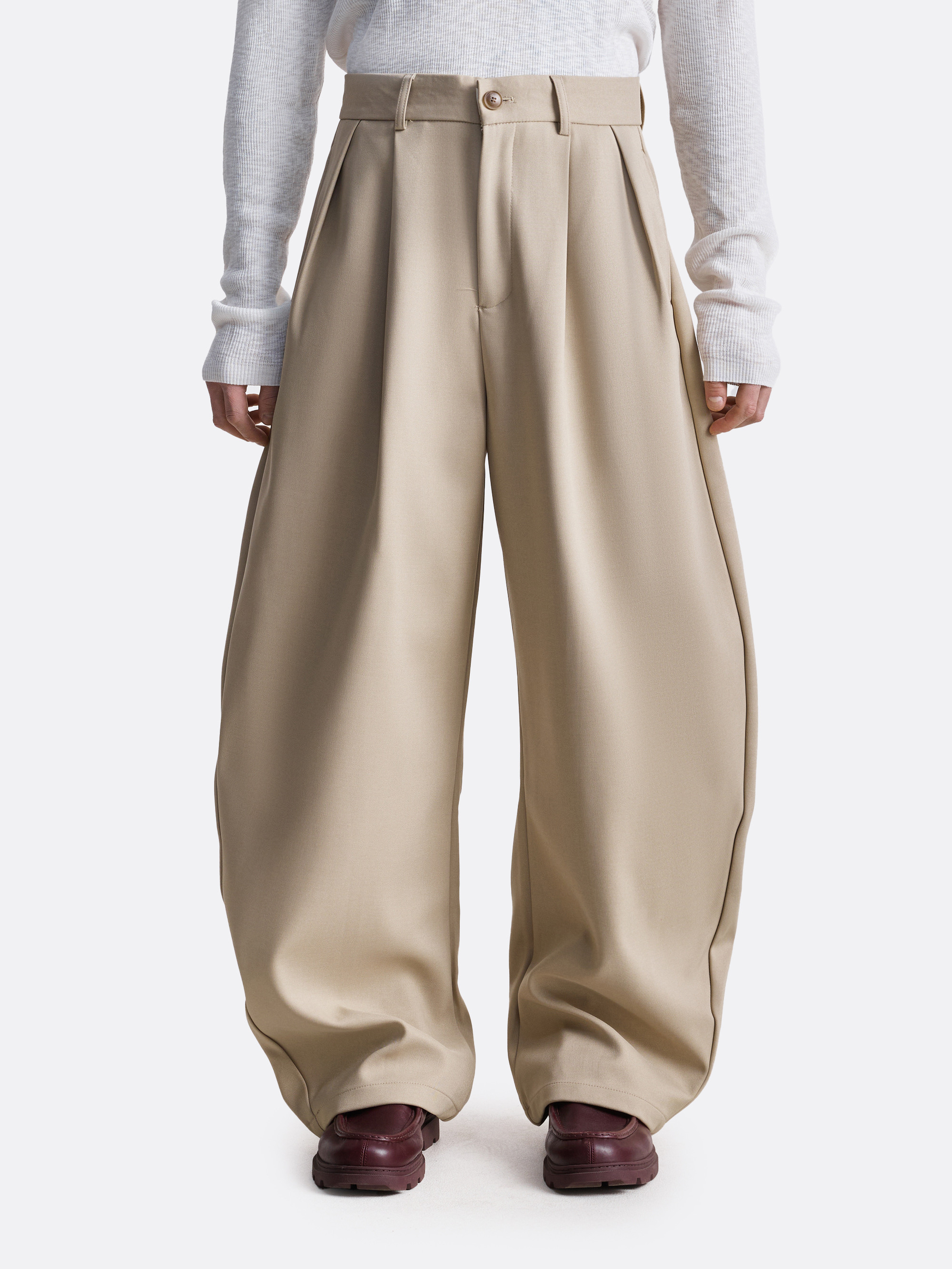 Широкие брюки с выразительной архитектурой линии бёдер, построенные на мягких вертикальных вытачках, которые формируют фирменный «гравитационный» силуэт. Посадка — комфортная, с классической талией и застёжкой на пуговицу, плюс аккуратные шлёвки для ремня. Сзади — лаконичные прорезные карманы, подчёркивающие строгую геометрию модели. Фактура материала держит объём и сохраняет чистоту формы при движении. Брюки, которые одновременно выглядят сдержанно и экспериментально — идеальная база для современного кроя.