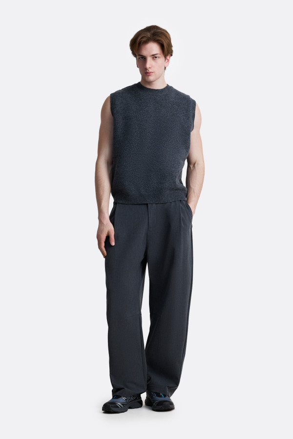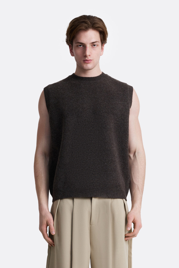 Минималистичный вязаный жилет из плотного материала с добавлением шерсти — лаконичный, но выразительный. Без лишних деталей, с акцентом на форму и текстуру: высокий круглый вырез, ровный низ, аккуратная резинка по краям. Матовая пряжа с едва заметным меланжевым эффектом придаёт жилету глубину, а свободный крой делает его универсальным слоем — самостоятельным или в паре с базой.