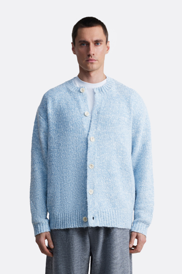 Вязаный кардиган мягкого со слегка рыхлой, «облачной» фактурой, создающей ощущение невесомости и комфорта. Свободный силуэт, крупные светлые пуговицы и уплотнённая резинка по краю добавляют аккуратную структуру, не забирая у вещи её расслабленного характера. Тактильно объёмный и уютный, легко вписывающийся в повседневные образы, привнося в них лёгкость.