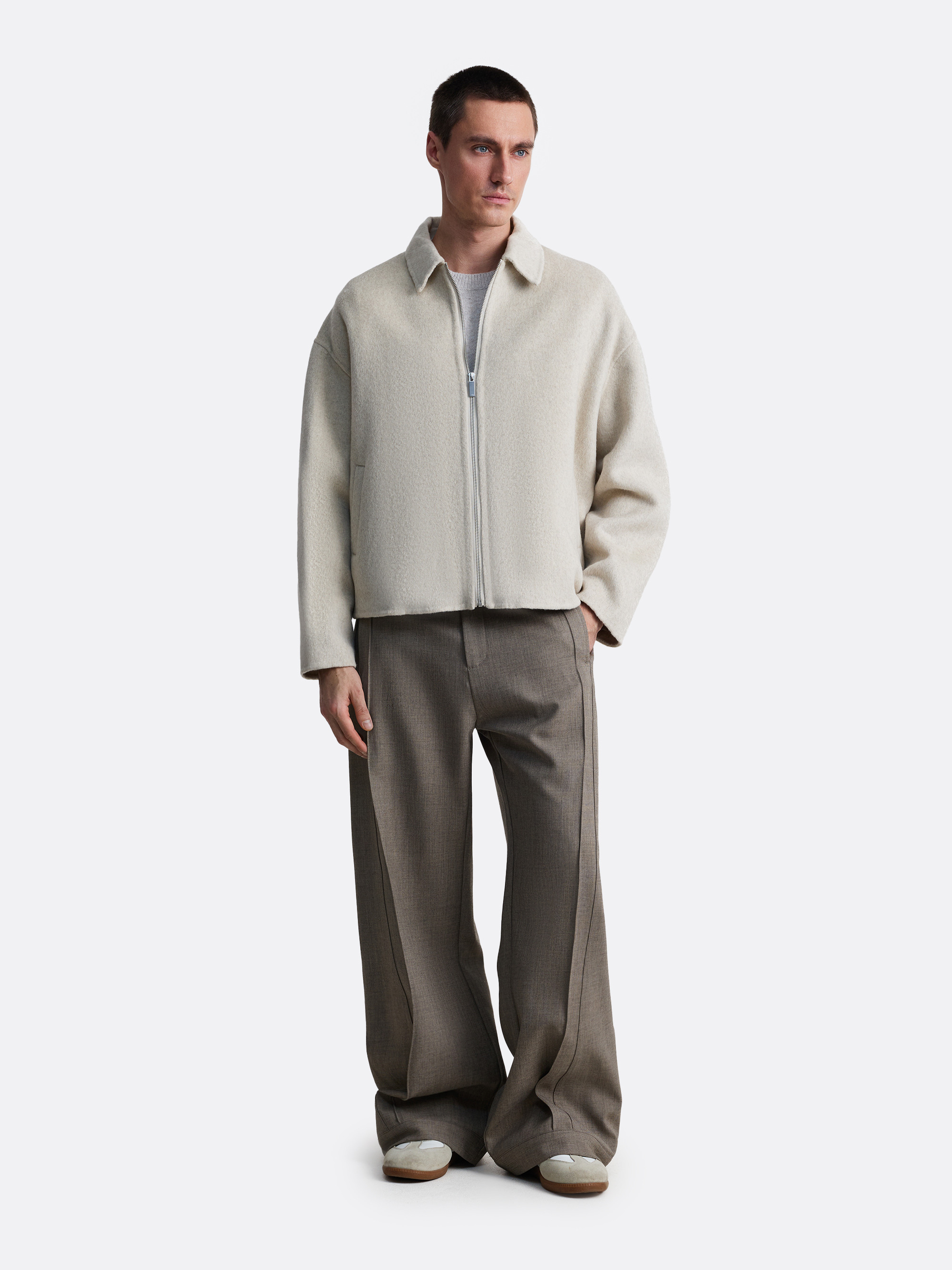 Укороченный жакет с мягкой округлой линией плеч и прямым силуэтом. Плотный материал на основе шерсти с ворсистой фактурой держит форму и добавляет объёма. Молния визуально чистит центр и подчёркивает минималистичный крой. Втачные боковые карманы.
