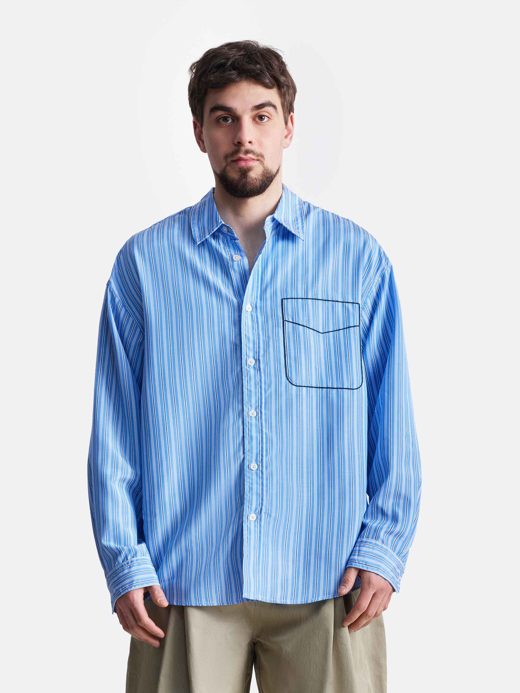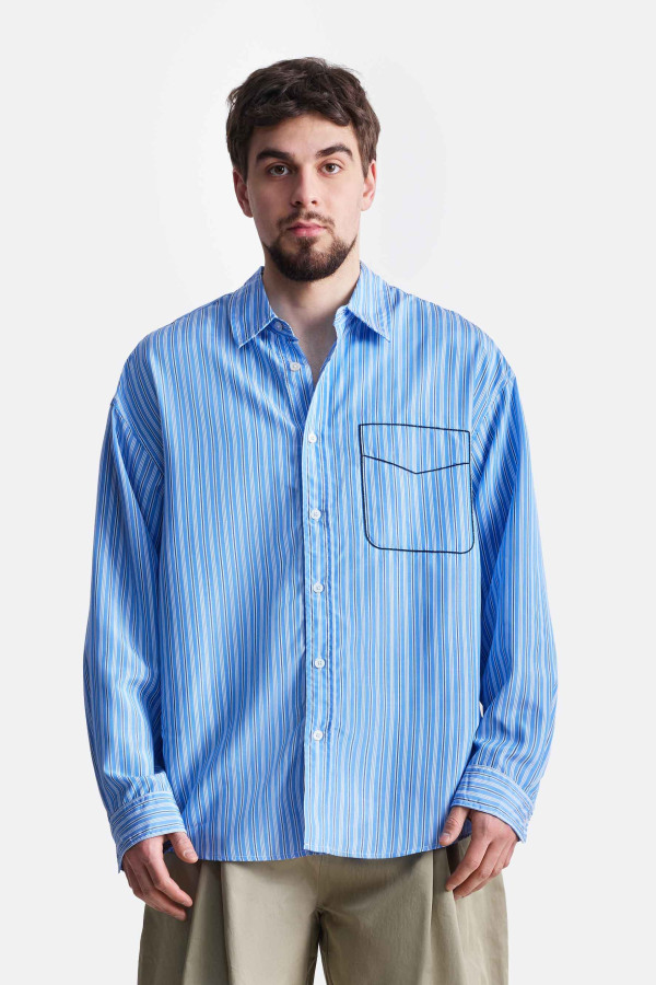 Свободная рубашка в вертикальную полоску с акцентным нагрудным карманом, оформленным контрастной черной окантовкой. Прямой силуэт и спущенная линия плеча создают расслабленную посадку. Классический воротник и аккуратная планка на пуговицах добавляют модели сдержанности, сохраняя выразительный акцент в деталях.