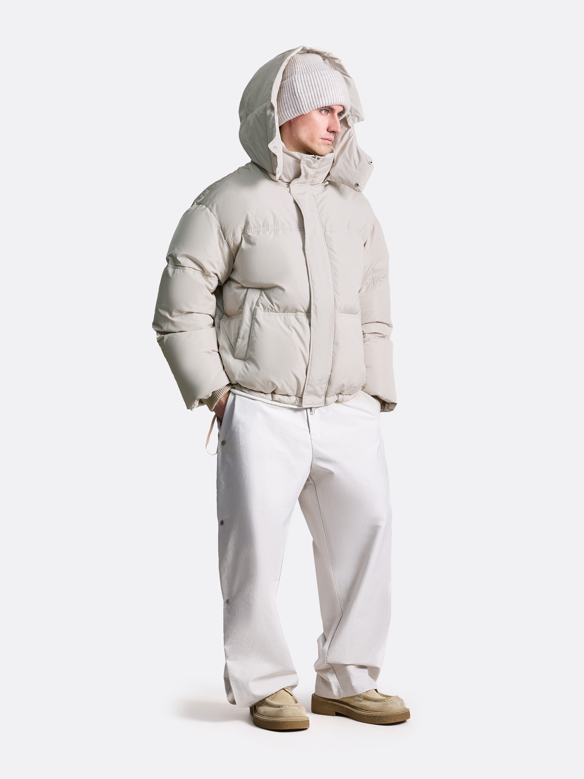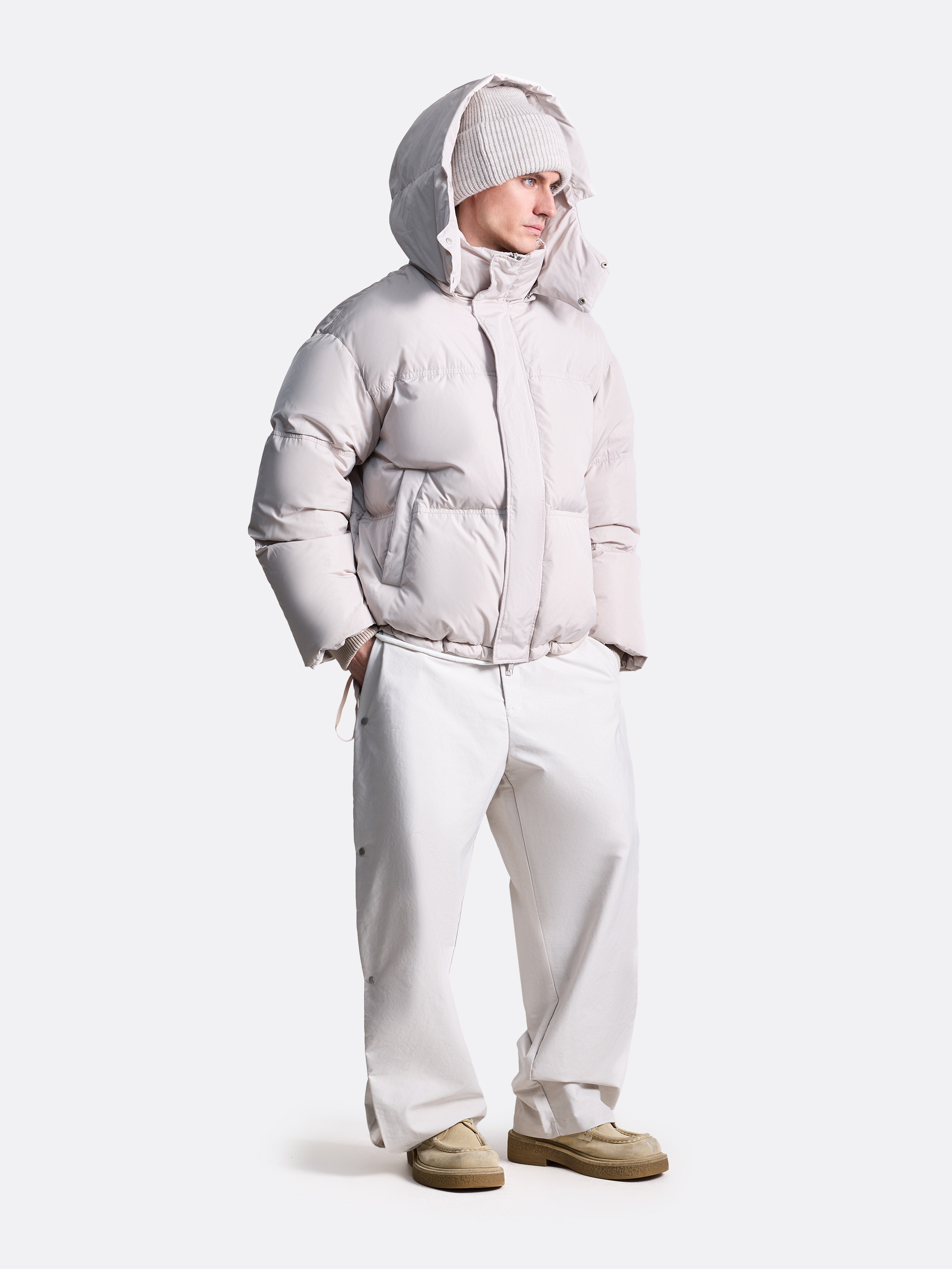 Зимний пуховик оверсайз-силуэта. Акцентная стёганая текстура с крупными сегментами, высокий утеплённый воротник-стойка, плавно переходящий в объёмный интегрированный съемный капюшон с мини козырьком. Центральная застёжка на молнии скрыта под планкой, которая фиксируется на кнопки. Трикотажные манжеты держатся на запястье, предотвращая попадание холода. Снизу пуховик дополнен скрытой кулиской, которая делает модель максимально адаптированной и многогранной. За счет нее куртку возможно регулировать в длине и объеме. Пуховик выполнен из мягкого нейлона, отталкивает влагу и не пропускает холодный ветер. В качестве утеплителя здесь использована смесь из натурального утиного пуха и пера.