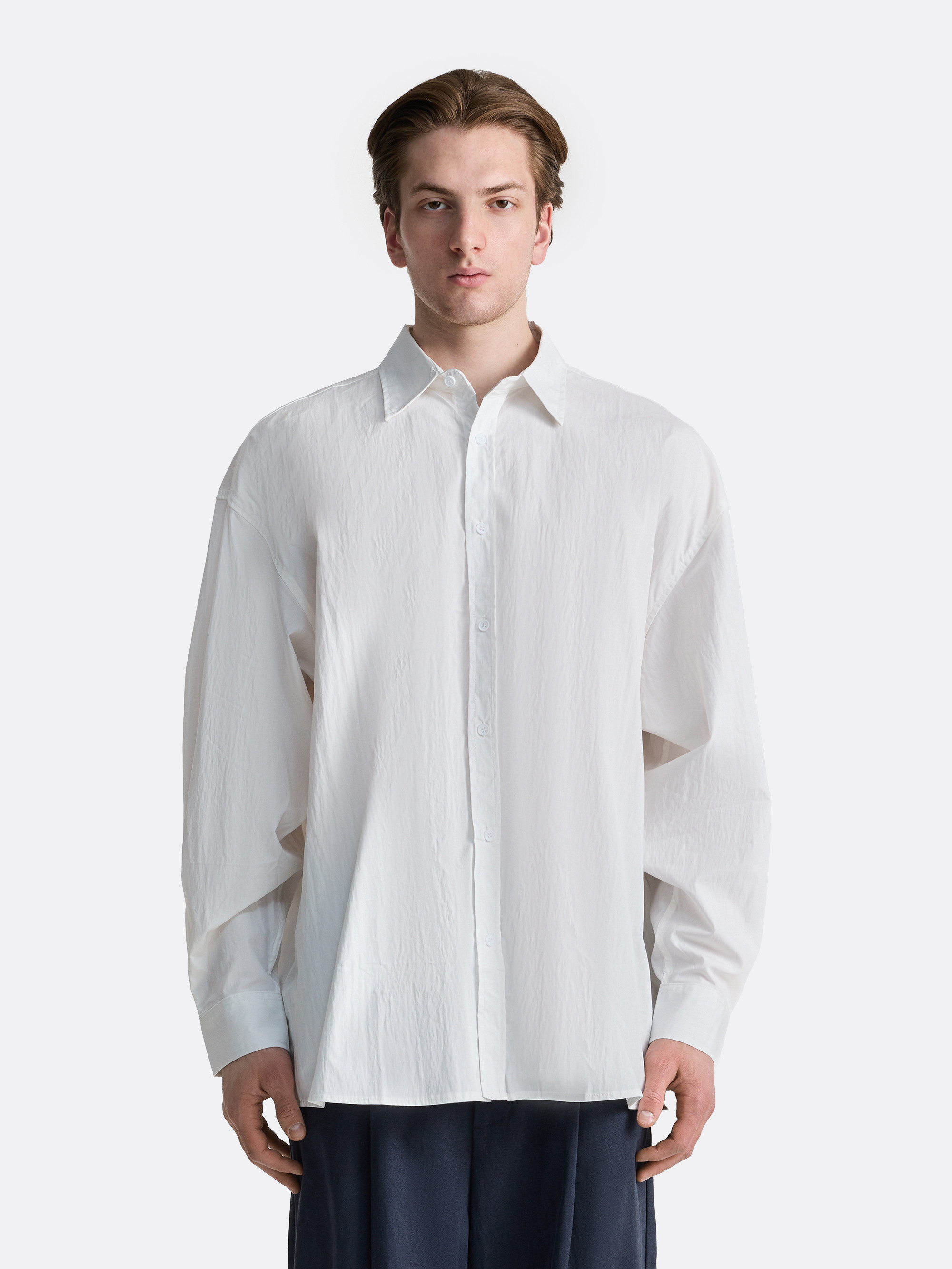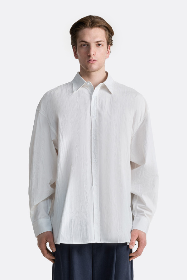 Рубашка с выразительной фактурой ткани. Материал достаточно плотный и держит форму. Поверхность ткани имеет выраженную текстуру, что добавляет глубину белому цвету и делает модель модель визуально более насыщенной.