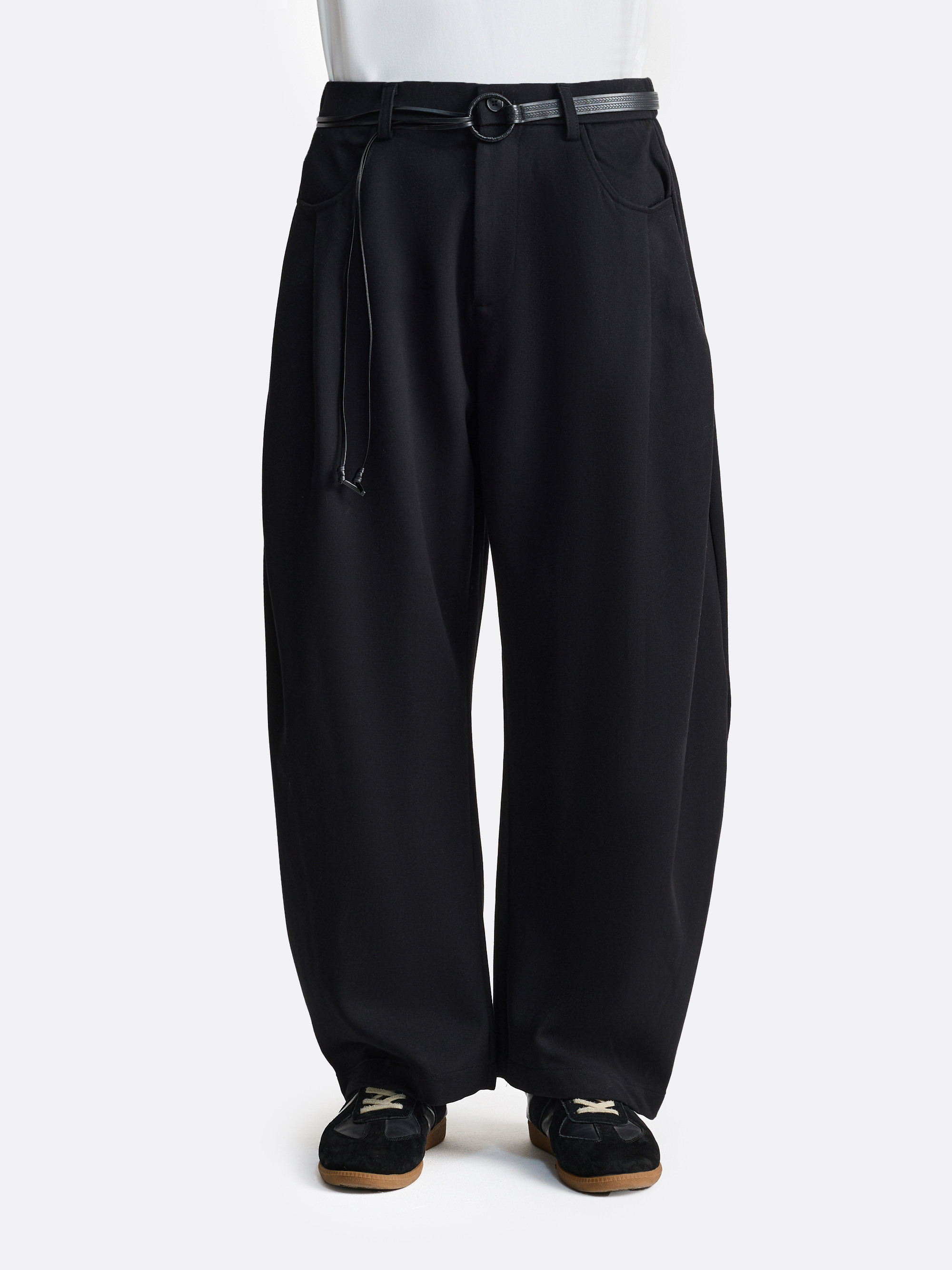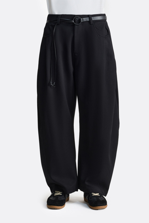 Брюки свободного силуэта с выразительным поясом, дополненным длинным декоративным ремешком с круглой пряжкой, создавая асимметричный акцент. Свободный крой и мягкие складки от пояса создают плавный объём по всей длине. Брюки сохраняют форму и при этом остаются комфортными в движении.