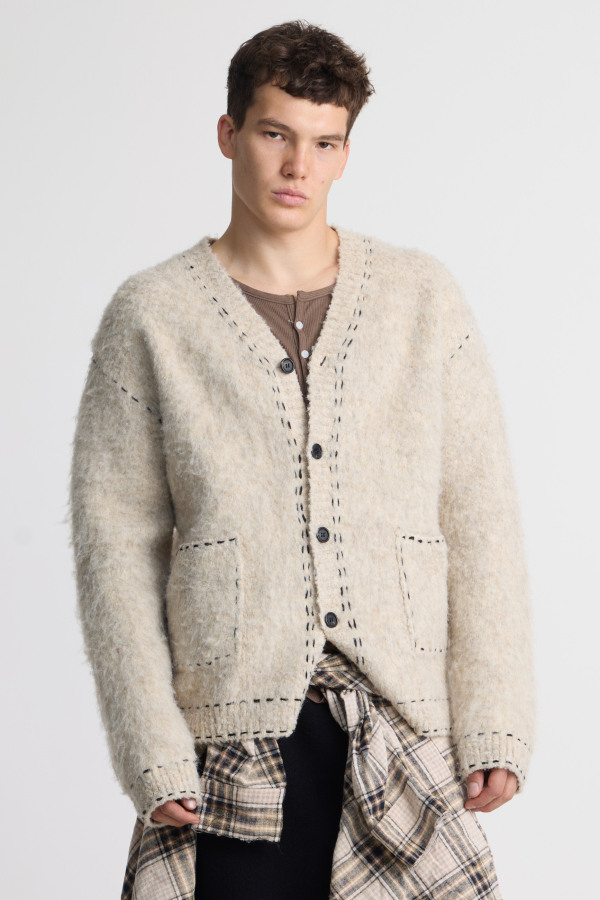 Вязаный кардиган свободного кроя с V-образным вырезом. Выполнен из мягкого махрящегося материала, эффект которого усиливается после стирки. Дополнен декоративной строчкой по линии застежки, карманов, линии пояса и рукавов. Дополнен объемными карманами. Застежка на пластиковых пуговицах с имитацией натурального камня.