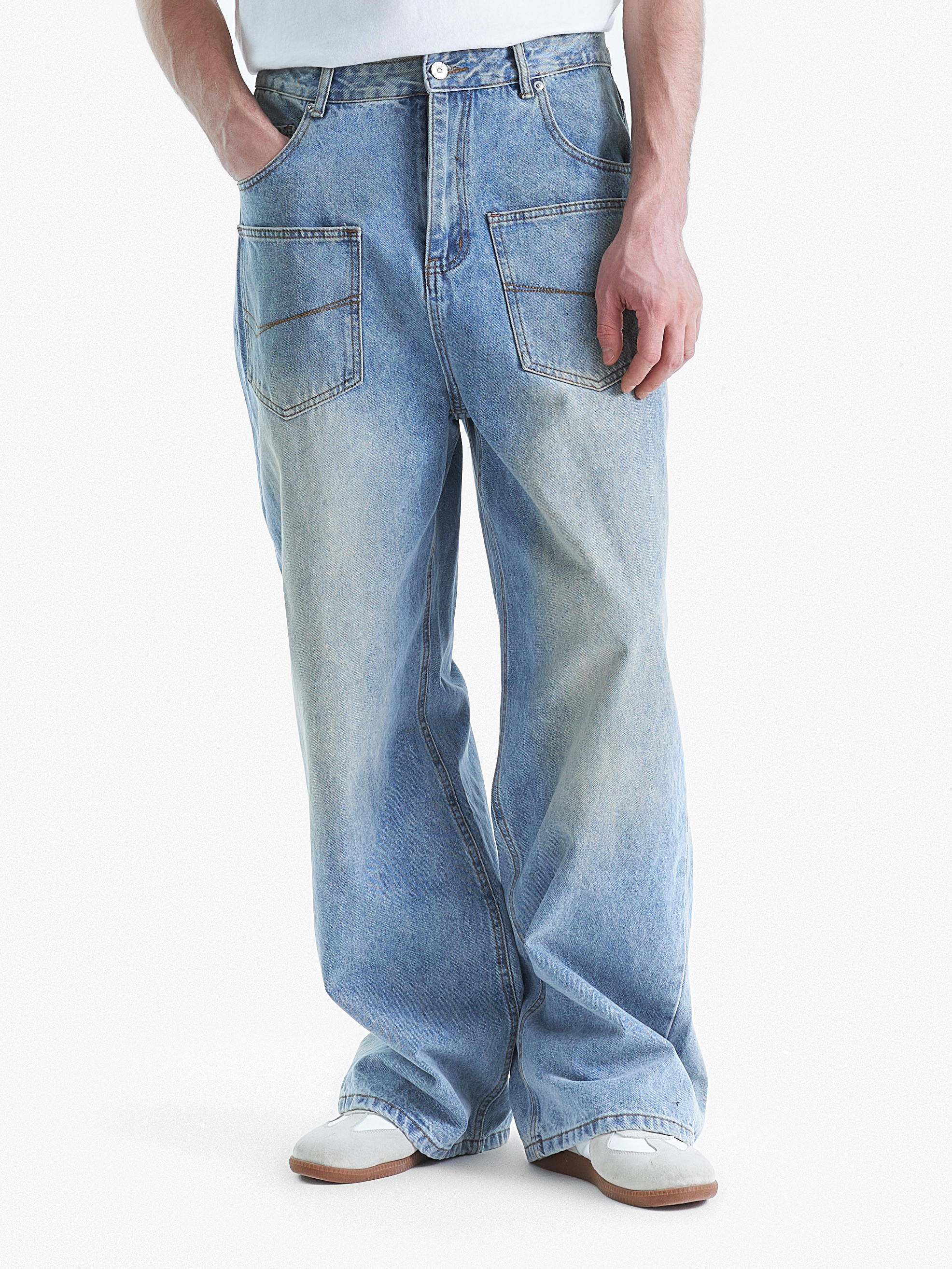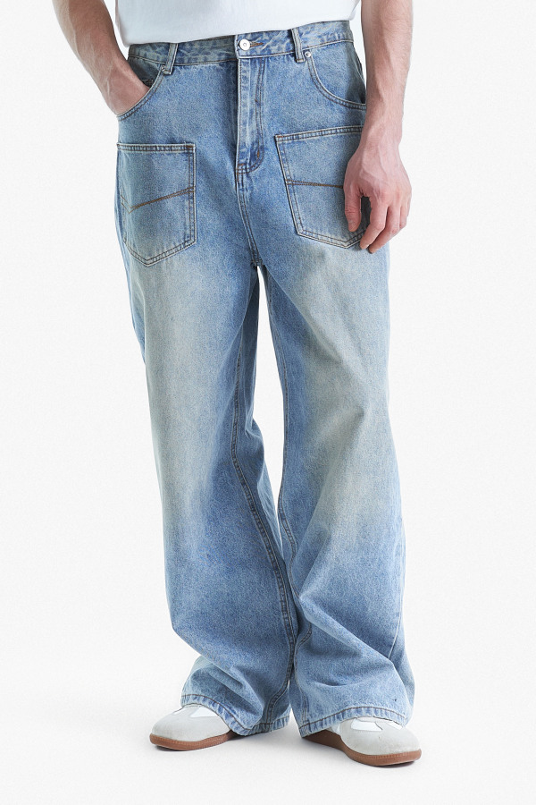 | Джинсы свободного кроя с объемными накладными карманами на передней части, выполненные из плотного денима. Светло-голубой оттенок с эффектом потертости создает расслабленный и винтажный стиль. Классическая посадка на талии и просторные штанины обеспечивают комфорт в движении. Декоративная строчка подчеркивает акцент на деталях. Идеально подходят для создания повседневного городского образа. |