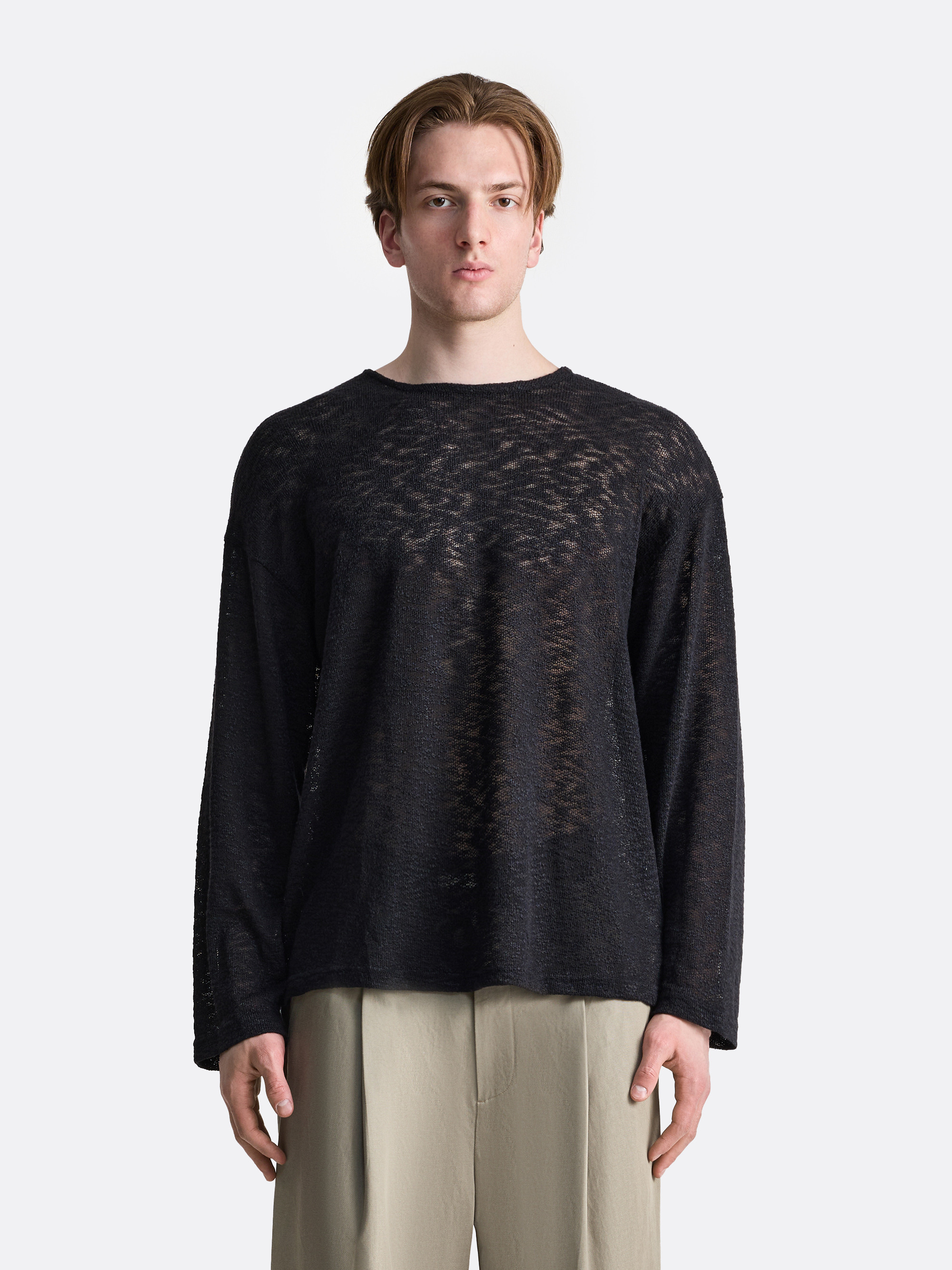 Свободный лонгслив в теплых тонах, выполнен из лёгкой текстурной трикотажной ткани с едва заметной полупрозрачной фактурой. Классический круглый вырез с необработанным краем и слегка опущенная линия плеч создают расслабленный, многослойный силуэт, а также делают этот лонгслив универсальным базовым изделием для всех, кто ценит осознанность и минимализм.