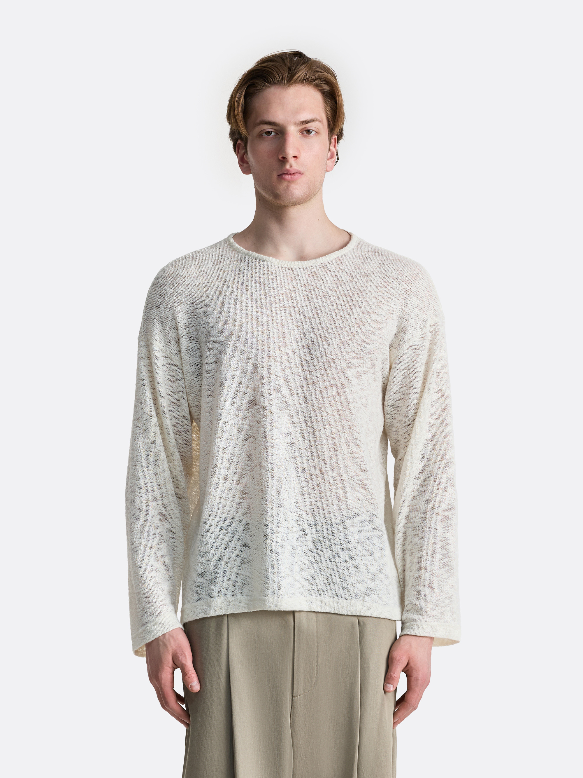 Свободный лонгслив в теплых тонах, выполнен из лёгкой текстурной трикотажной ткани с едва заметной полупрозрачной фактурой. Классический круглый вырез с необработанным краем и слегка опущенная линия плеч создают расслабленный, многослойный силуэт, а также делают этот лонгслив универсальным базовым изделием для всех, кто ценит осознанность и минимализм.