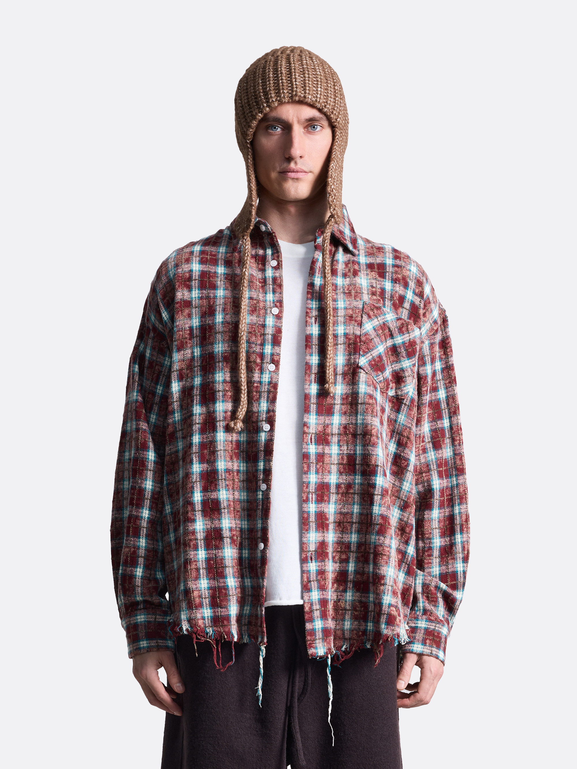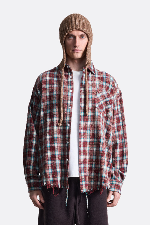 Клетчатая рубашка оверсайз-кроя с рваными краями снизу - наш бестселлер. Выполнена из плотного и при этом мягкого хлопка. Имеет по складке на кокетке с каждой стороны. Дополнена функциональным нагрудным карманом. Застежка на пуговицах с имитацией перламутра. Рубашка представлена в красном и бордовом цветах.