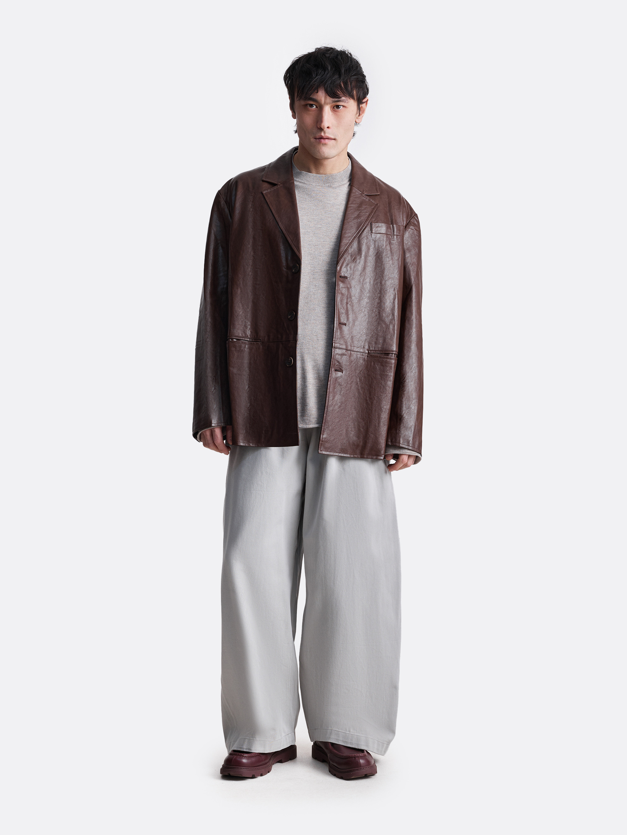 Пиджак из эко-кожи оверсайз-кроя. Пиджак имеет застежку на пуговицы и слегка спущенную линию плеч, что придает ему элегантный и строгий вид. Модель дополнена накладным карманом на груди и по бокам, что добавляет изделию завершенности. Пиджак представлен в черном и коричневом цветах.