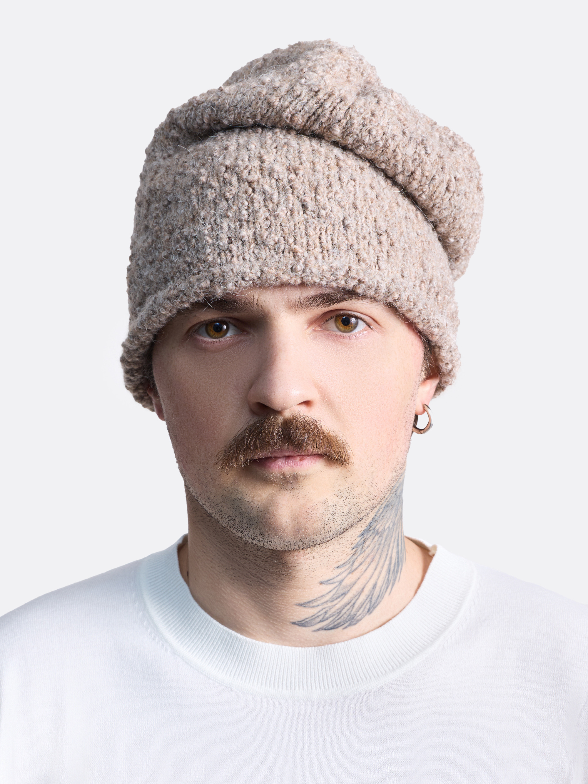 Вязаная шапка с объёмной фактурой. Особенность модели — слегка небрежный, «свободный» крой с наслоением. Мягкая пряжа обеспечивает комфорт при носке и отличную термоизоляцию, идеально подходящую для прохладной погоды. Шапка представлена в бежевом, молочном и черном цветах.