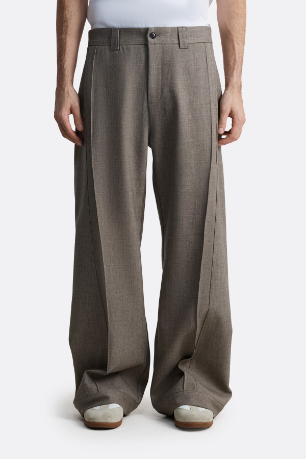 Свободные брюки с плавной, расслабленной посадкой и выраженной линией стрелок. Мягкая ткань с добавлением шерсти формирует естественный драп и подчёркивает объёмный силуэт. Пояс со шлёвками, аккуратная застёжка на пуговицу и продуманные детали кроя задают чистый, современный ритм.