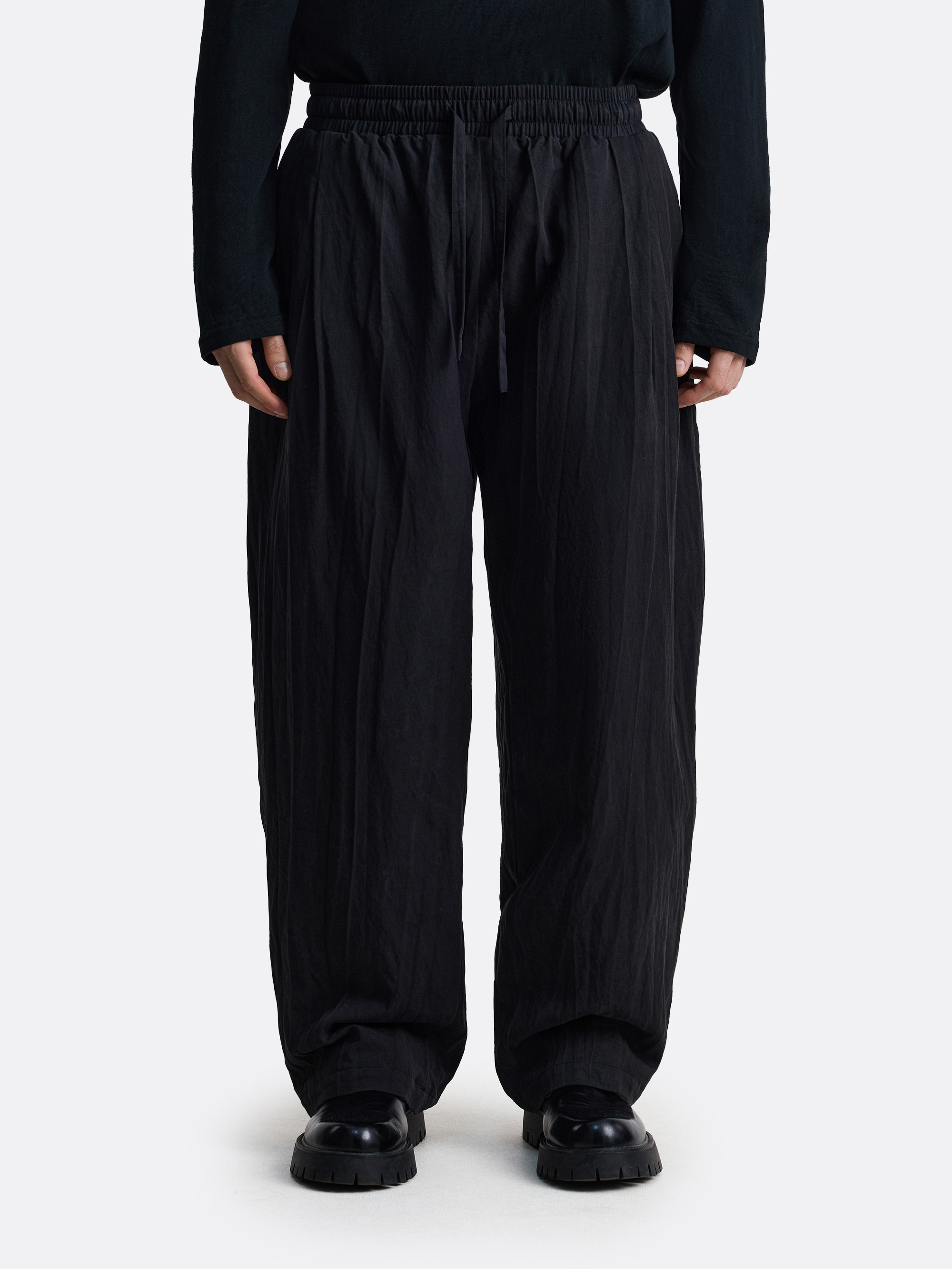 Широкие утепленные брюки с фактурой «смятой» ткани и глубокой посадкой. Эластичный пояс с регулируемым шнурком, мягкий прямой силуэт и характерные вертикальные заломы, которые создают ощущение движения даже в статике. Ткань драпируется свободно и естественно, образуя живую, неровную поверхность — спокойный минимализм с намёком на японскую эстетику.