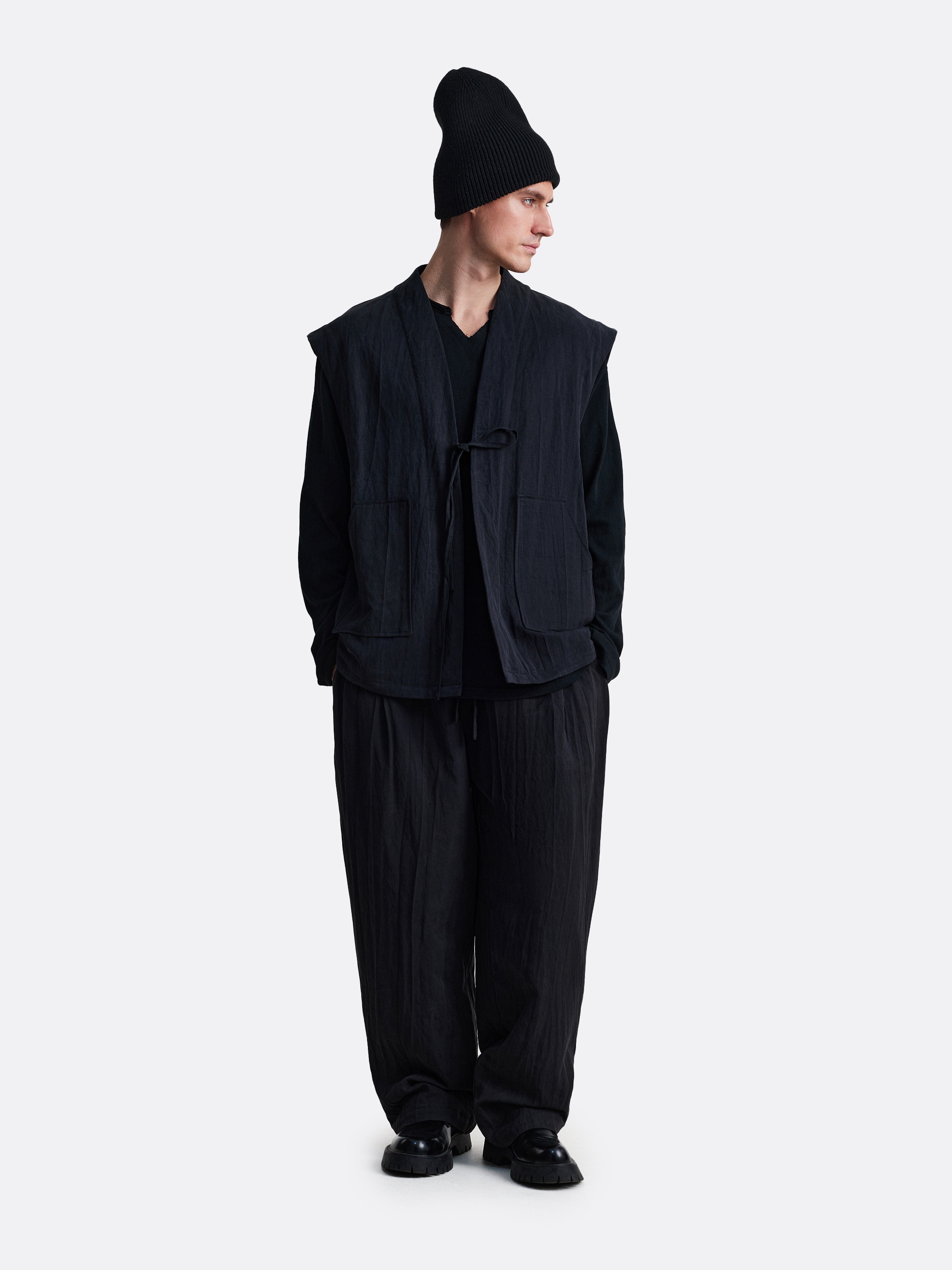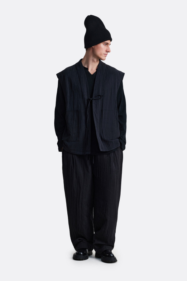 Утепленный жилет с азиатскими мотивами и завязкой вместо пуговиц. Минималистичный силуэт, крупные накладные карманы и выразительная текстура ткани. Материал держит форму, но остаётся мягким на ощупь — комфорт без излишков.