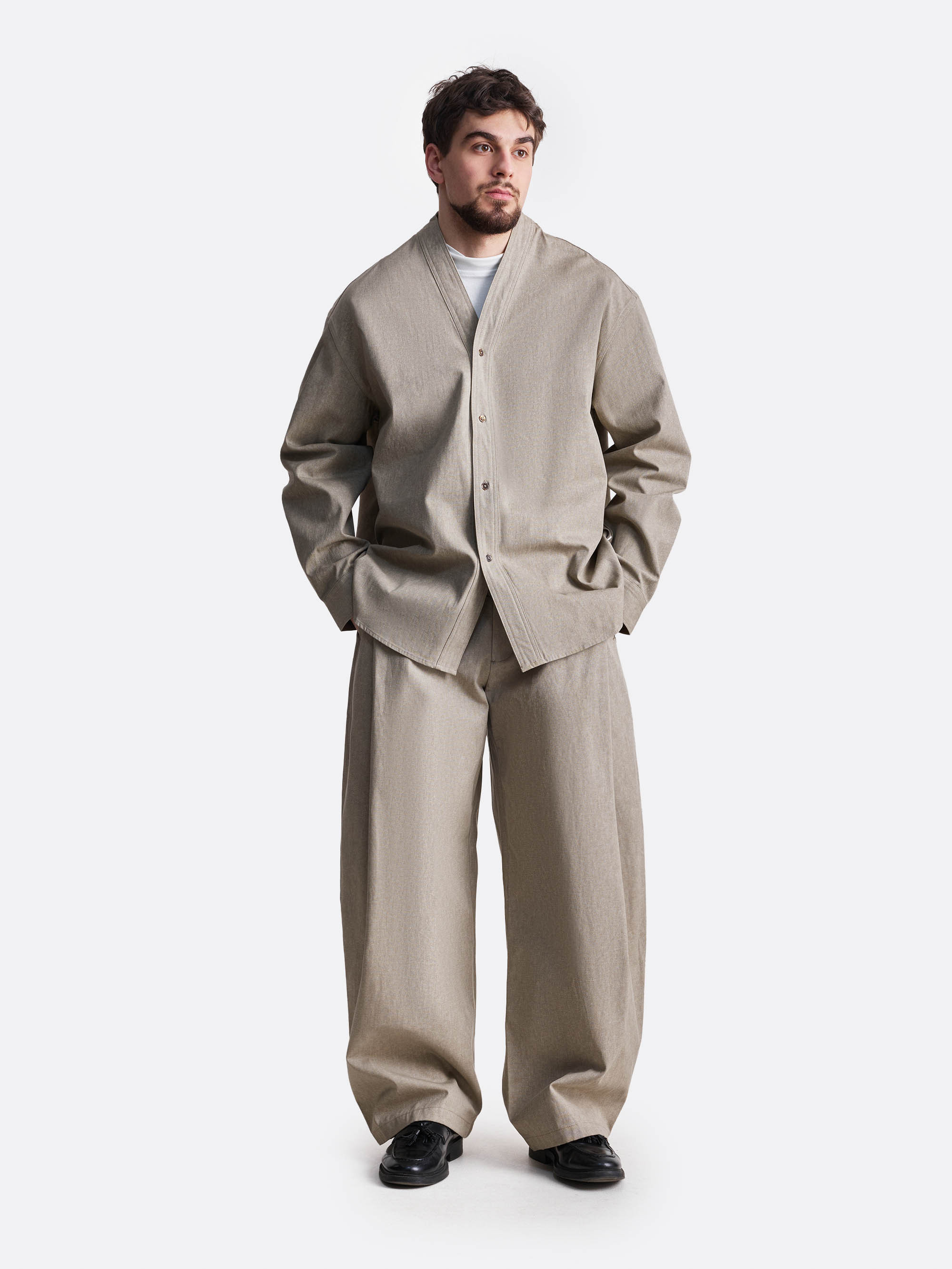 Кимоно свободного силуэта, выполненное из 100% хлопка, что подчеркивает его естественную фактуру и комфорт в носке, поддерживая идею осознанного минимализма. Лаконичный V-образный вырез без классического воротника формирует сдержанный, утилитарный образ, а свободная конструкция даёт ощущение воздуха и пространства.