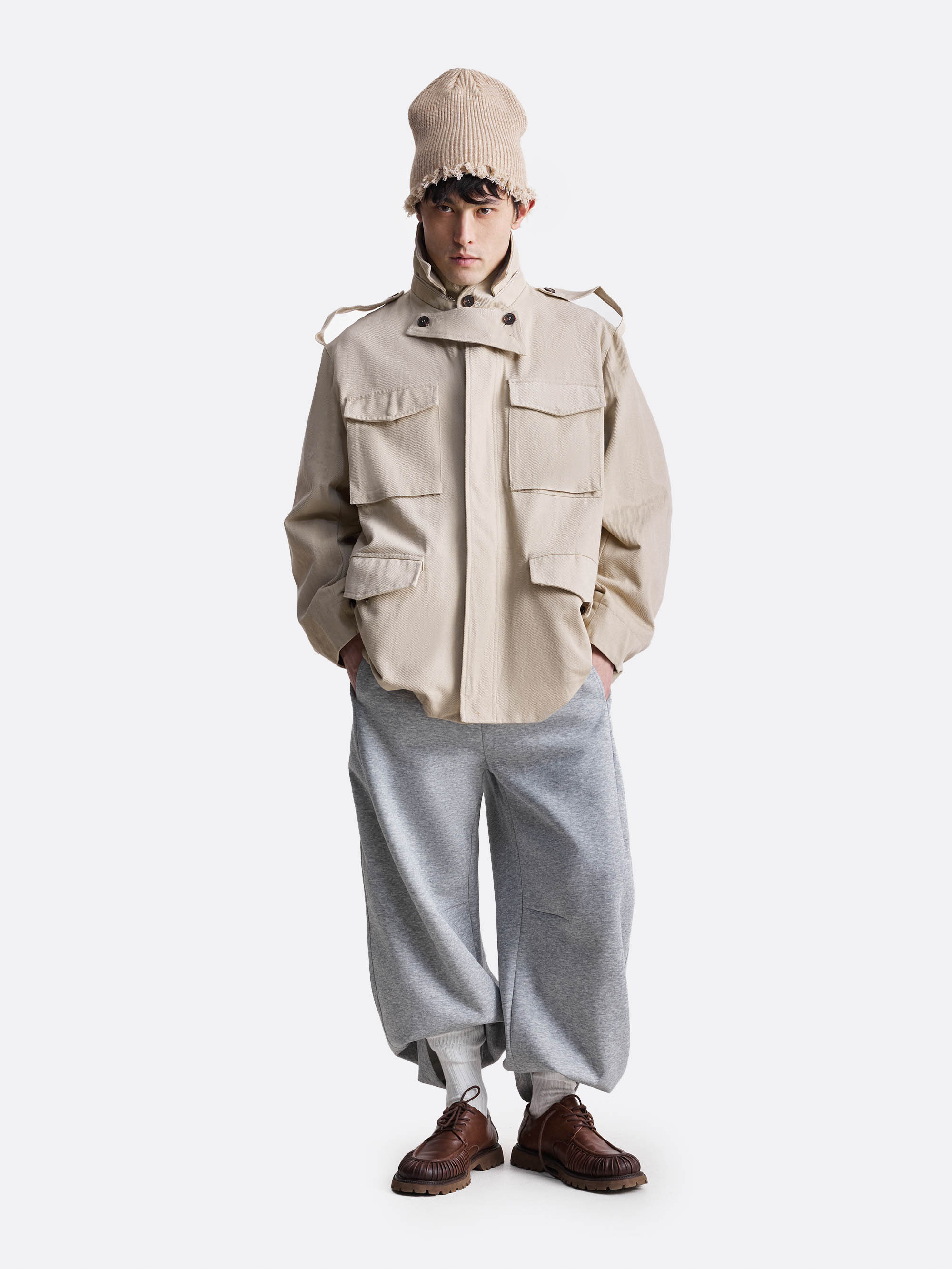 Куртка свободного кроя с акцентом на функциональные детали. Модель выполнена из плотного материала с выраженной текстурой, что придаёт ей структурный силуэт. Куртка дополнена четырьмя объёмными накладными карманами с клапанами, воротником-стойкой и застёжкой на пуговицы с ветрозащитной планкой. Универсальный силуэт и продуманные детали делают куртку практичной и актуальной для повседневного гардероба.