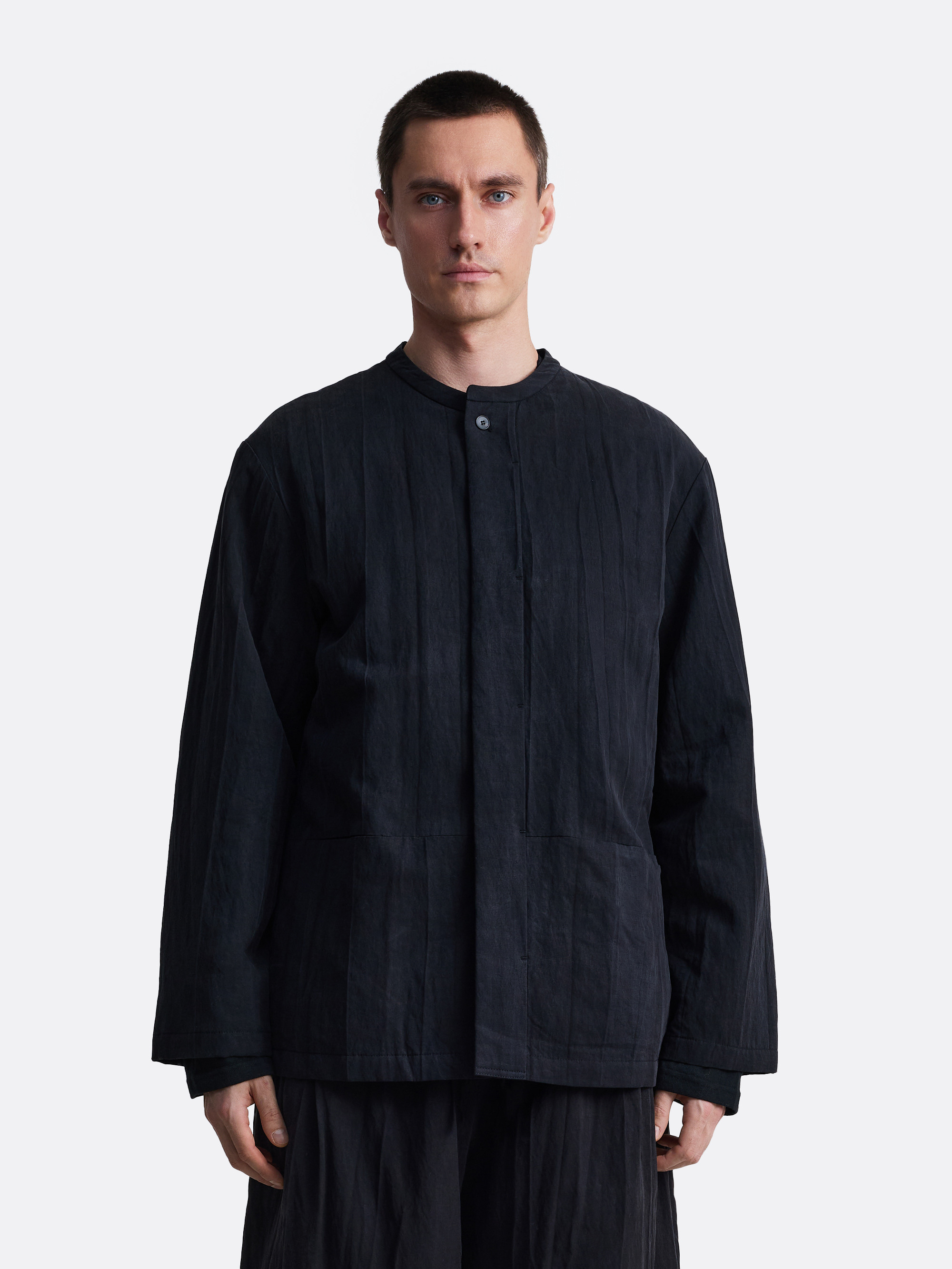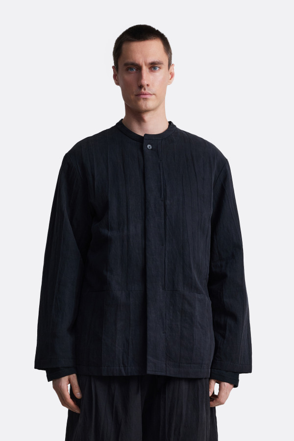 Утепленный пиджак-кимоно с лаконичным воротом и потайной застёжкой в тон. Вытканные вертикальные полосы едва уловимы, но именно они формируют выразительную фактуру изделия. Прямой силуэт, мягкий объём и глубокий чёрный оттенок подчеркивают эстетику минимализма с восточным акцентом.
