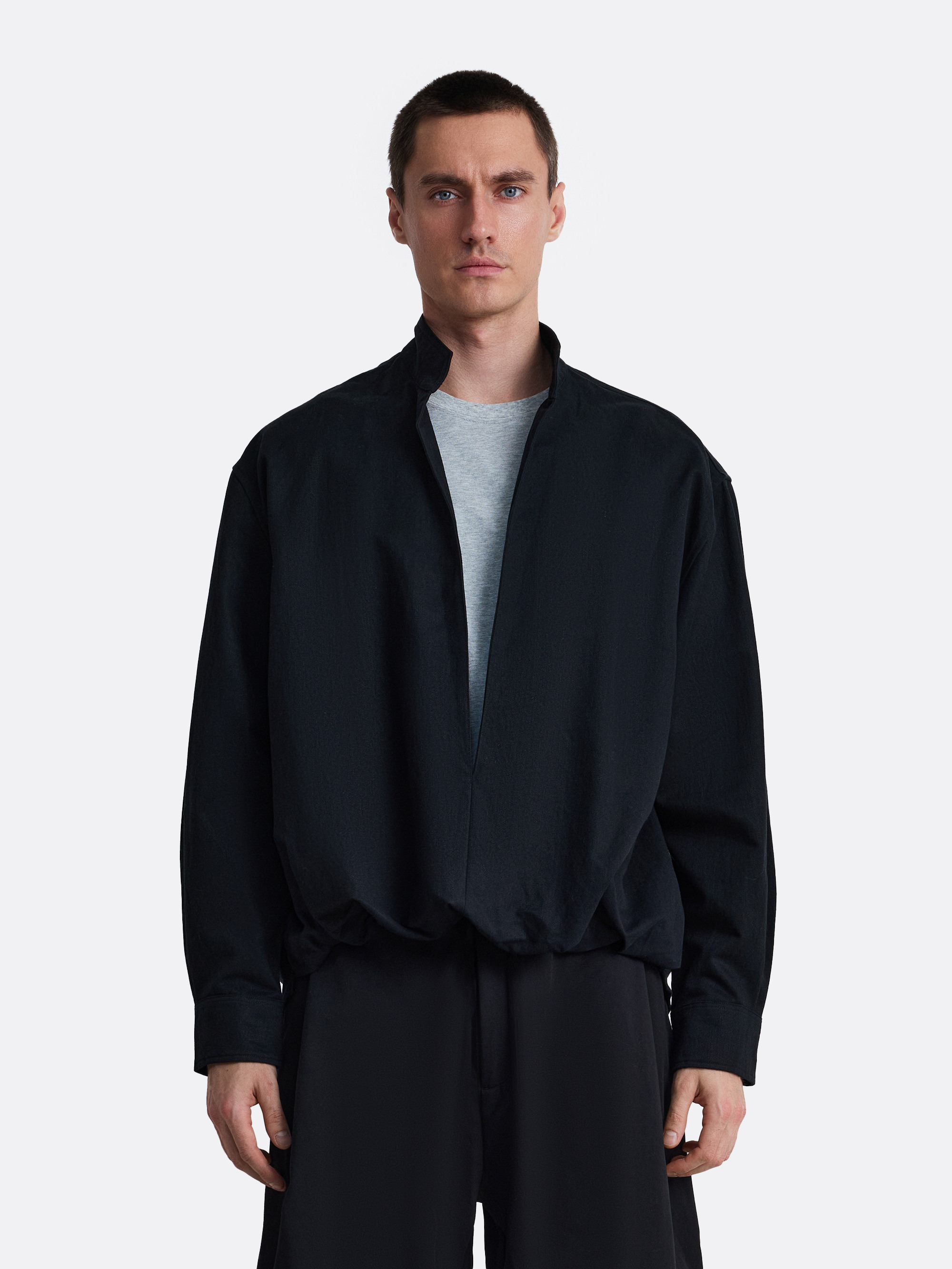 Джинсовая рубашка с вшитым первым слоем в виде майки. Плотная фактурная ткань держит форму и подчёркивает силуэт, а объёмная посадка, собранный низ и удлинение по спине добавляют архитектурности.