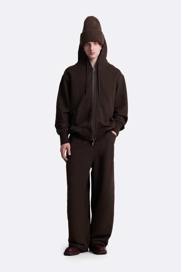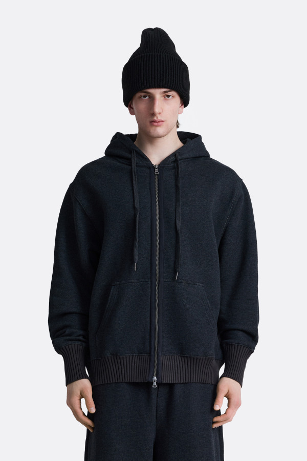 Объёмное худи на молнии в нескольких оттенках. Мягкое полотно с плотной вязкой, широкая резинка по низу и манжетам, удобный капюшон со шнурками и карман-кенгуру. Металлическая двусторонняя молния добавляет веса и визуального баланса. Материал — тактильно плотный, но не перегруженный.