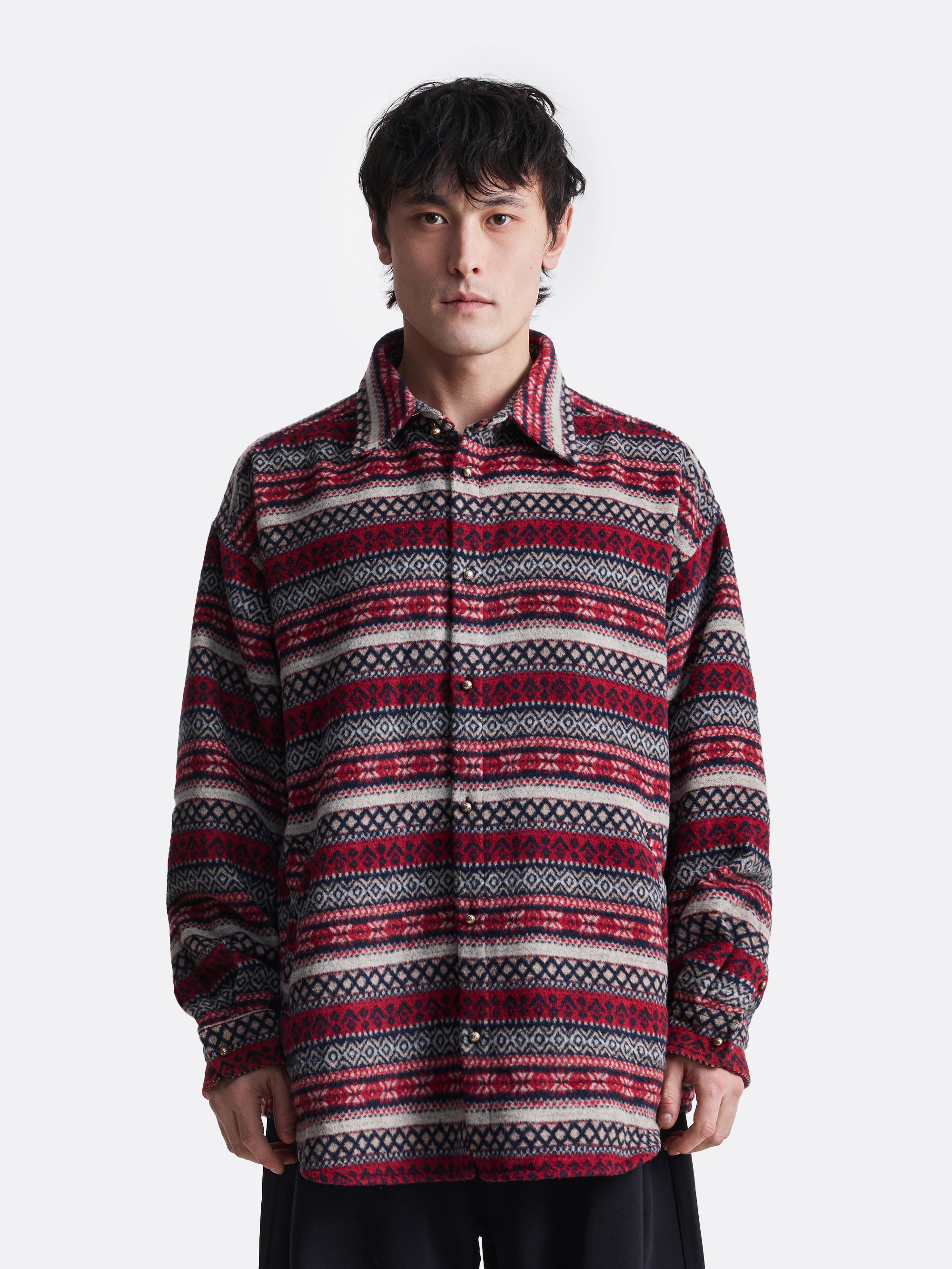Свободная рубашка с традиционными узорами. Узор состоит из геометрических элементов, таких как ромбы, треугольники и круги, что придает рубашке этнический стиль. Рубашка имеет длинные рукава и воротник, застегивающийся на пуговицы.
