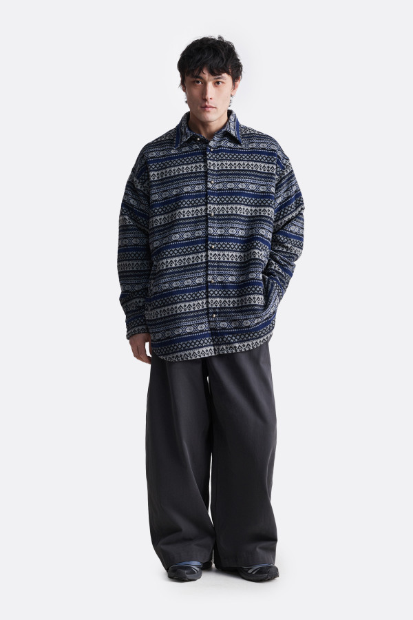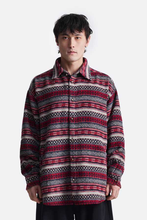 Свободная рубашка с традиционными узорами. Узор состоит из геометрических элементов, таких как ромбы, треугольники и круги, что придает рубашке этнический стиль. Рубашка имеет длинные рукава и воротник, застегивающийся на пуговицы.