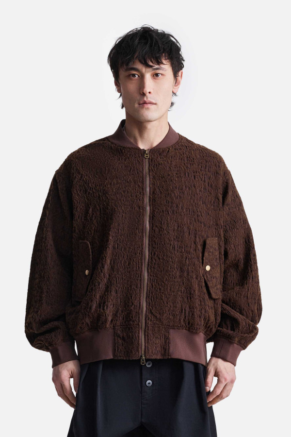 Куртка-бомбер свободного силуэта с объёмными рукавами и укороченной длиной. Модель выполнена из материала с выраженной фактурой, создающей визуальный объём и глубину цвета. Центральная застёжка на молнию дополнена эластичными манжетами и поясом. Накладные карманы с клапанами добавляют функциональный акцент и поддерживают баланс между минимализмом и выразительной текстурой.