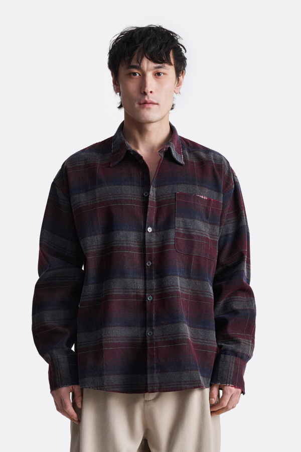 Укороченная рубашка в клетку. Модель выполнена из материала с потертым эффектом в темно-зеленом и бордовом цветах с тонкими полосками, что создает классический клетчатый узор. Рубашка имеет классический воротник и застегивается на пуговицы. На груди расположен небольшой карман с клапаном.