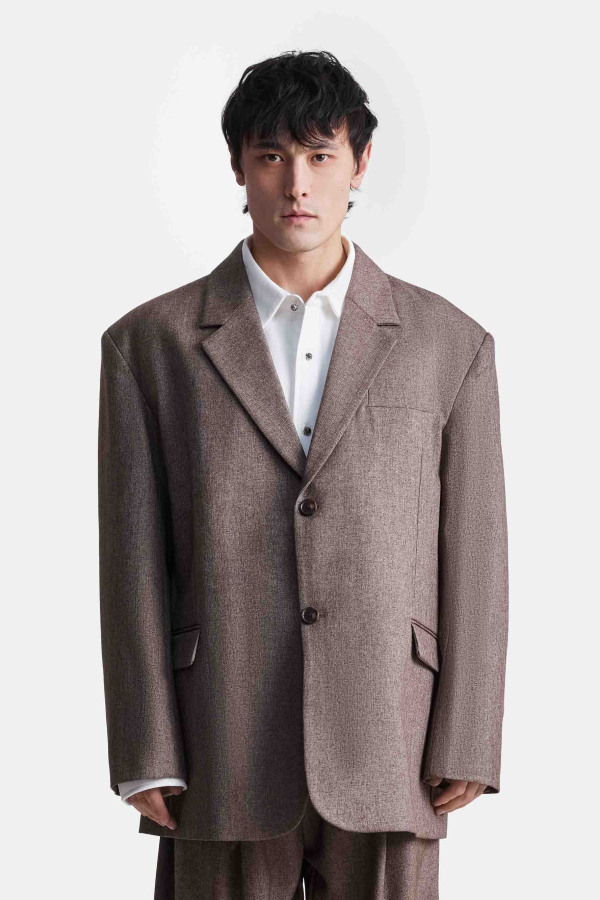 Однобортный пиджак удлинённого силуэта с чёткой линией плеч и классическими лацканами. Застёжка на пуговицы формирует аккуратный вертикальный акцент, спереди расположены прорезные карманы с клапанами и нагрудный карман.