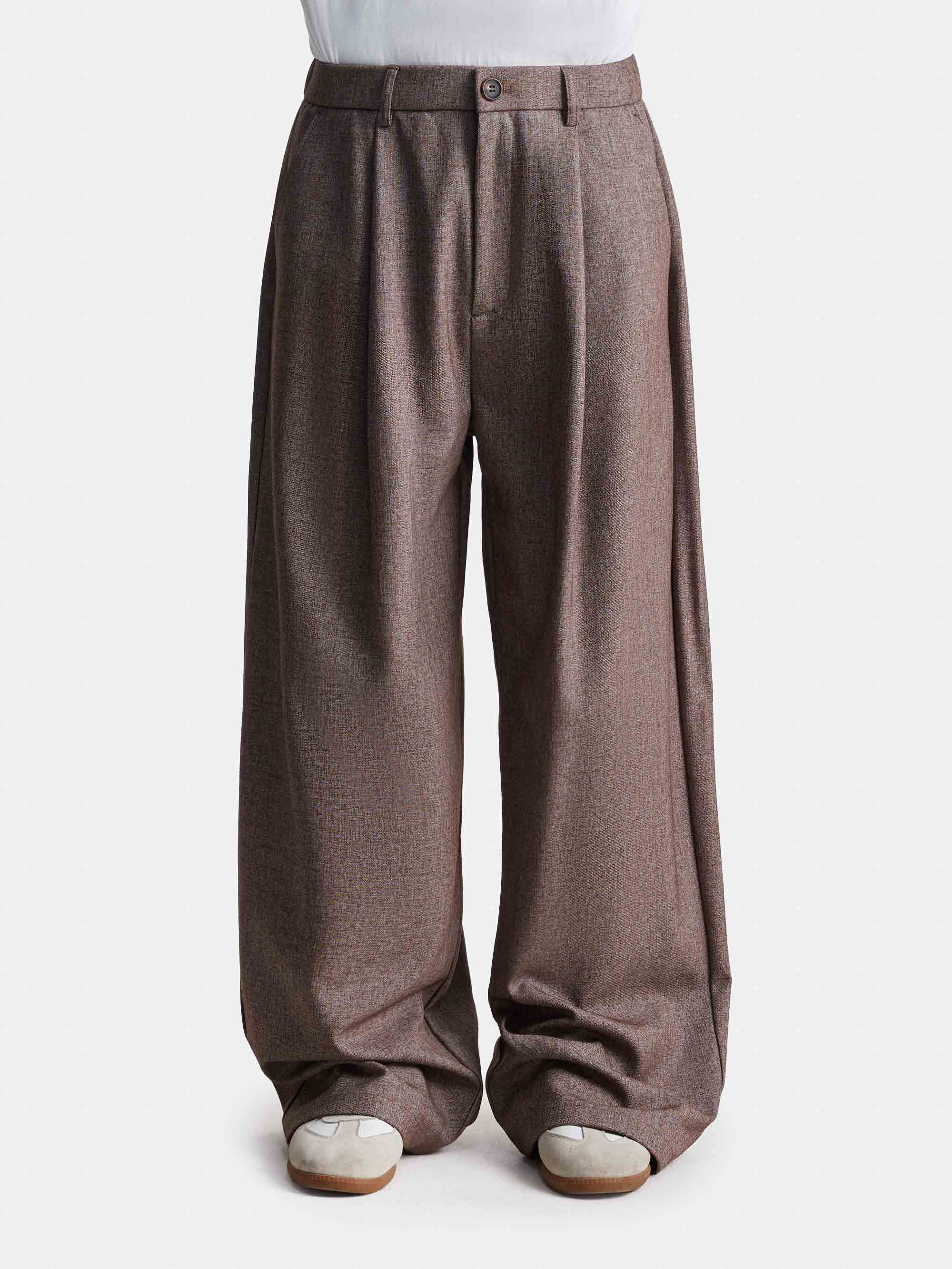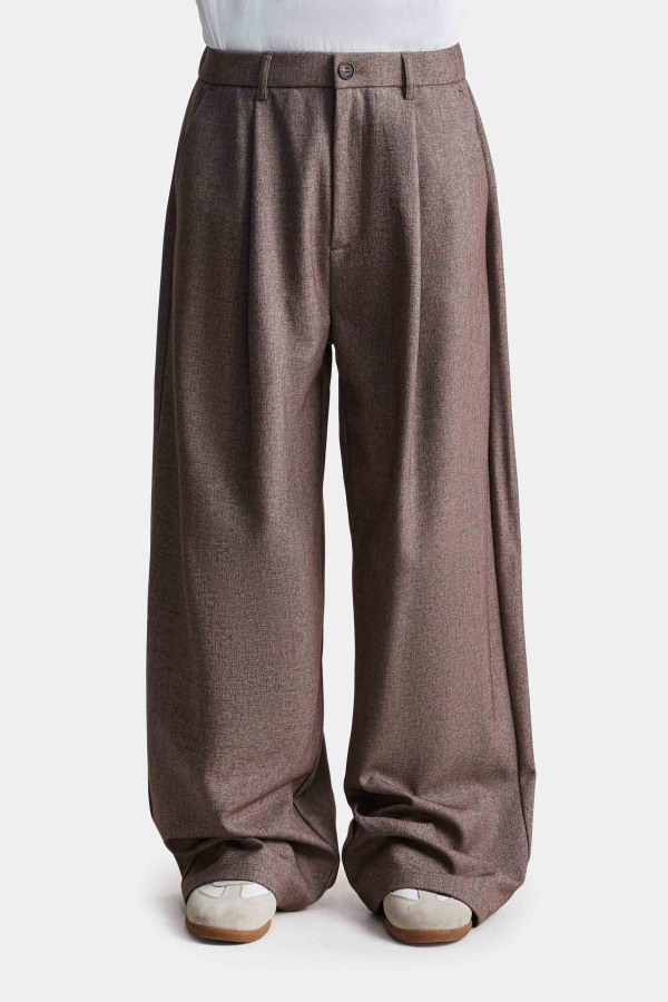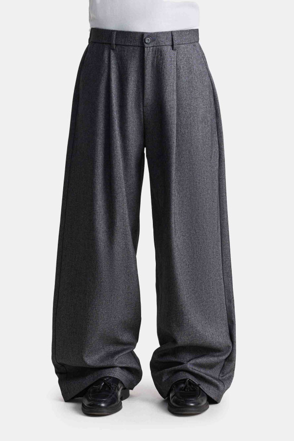 Модель с расширенным силуэтом и свободными прямыми штанинами. Глубокие складки у пояса создают дополнительный объём и мягкое движение ткани. Пояс со шлёвками и естественная драпировка формируют аккуратную посадку.