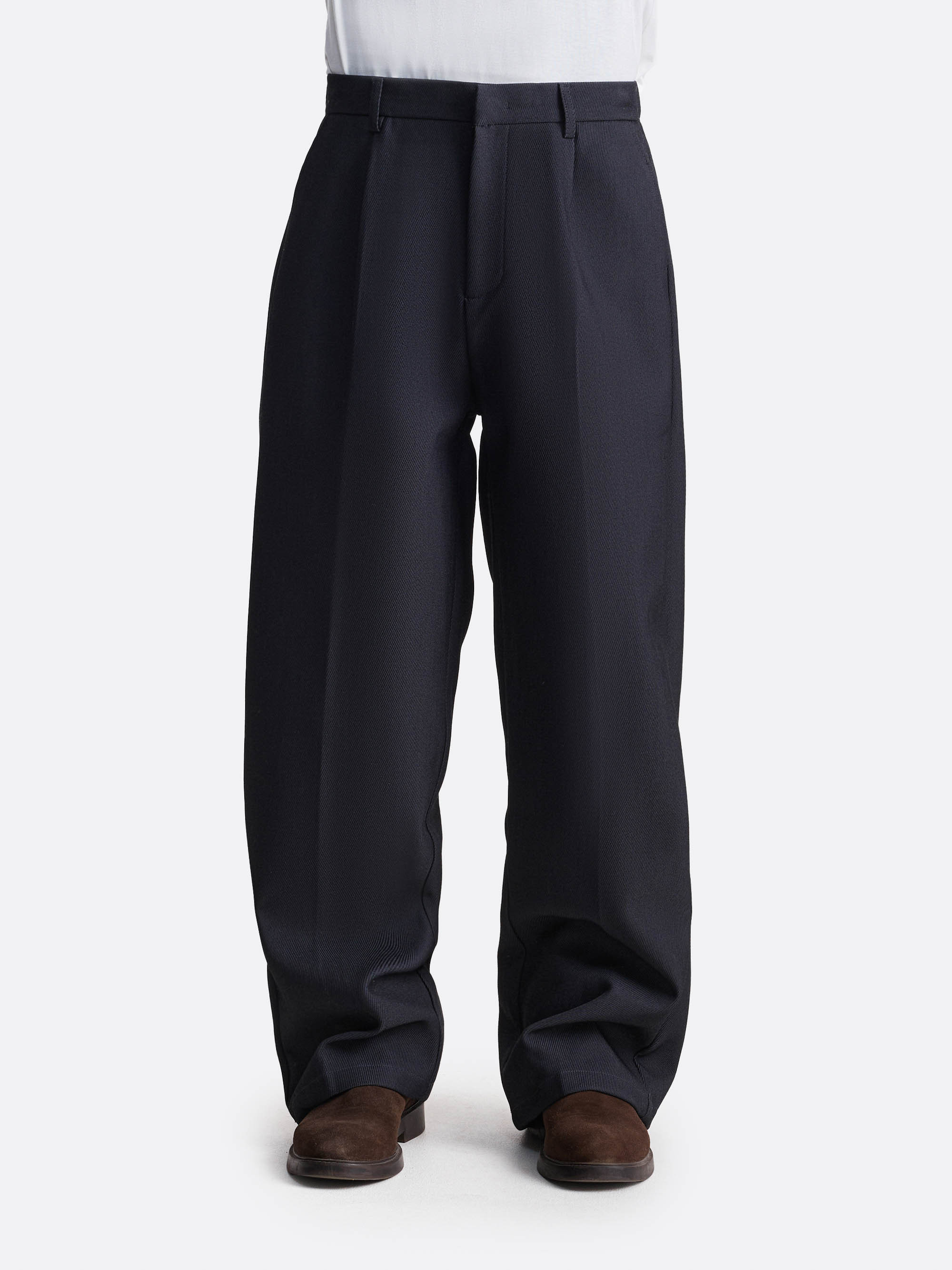 Брюки свободного силуэта с широкими прямыми штанинами и мягкой посадкой по талии. Передние защипы формируют дополнительный объём и подчёркивают вертикаль силуэта. Пояс со шлёвками фиксируется на застёжку, сохраняя аккуратную линию верха.