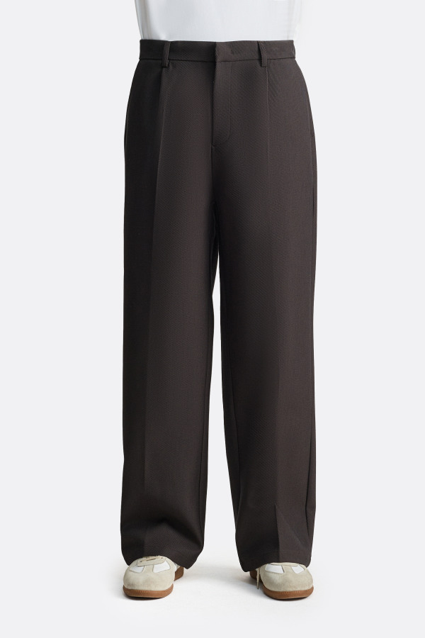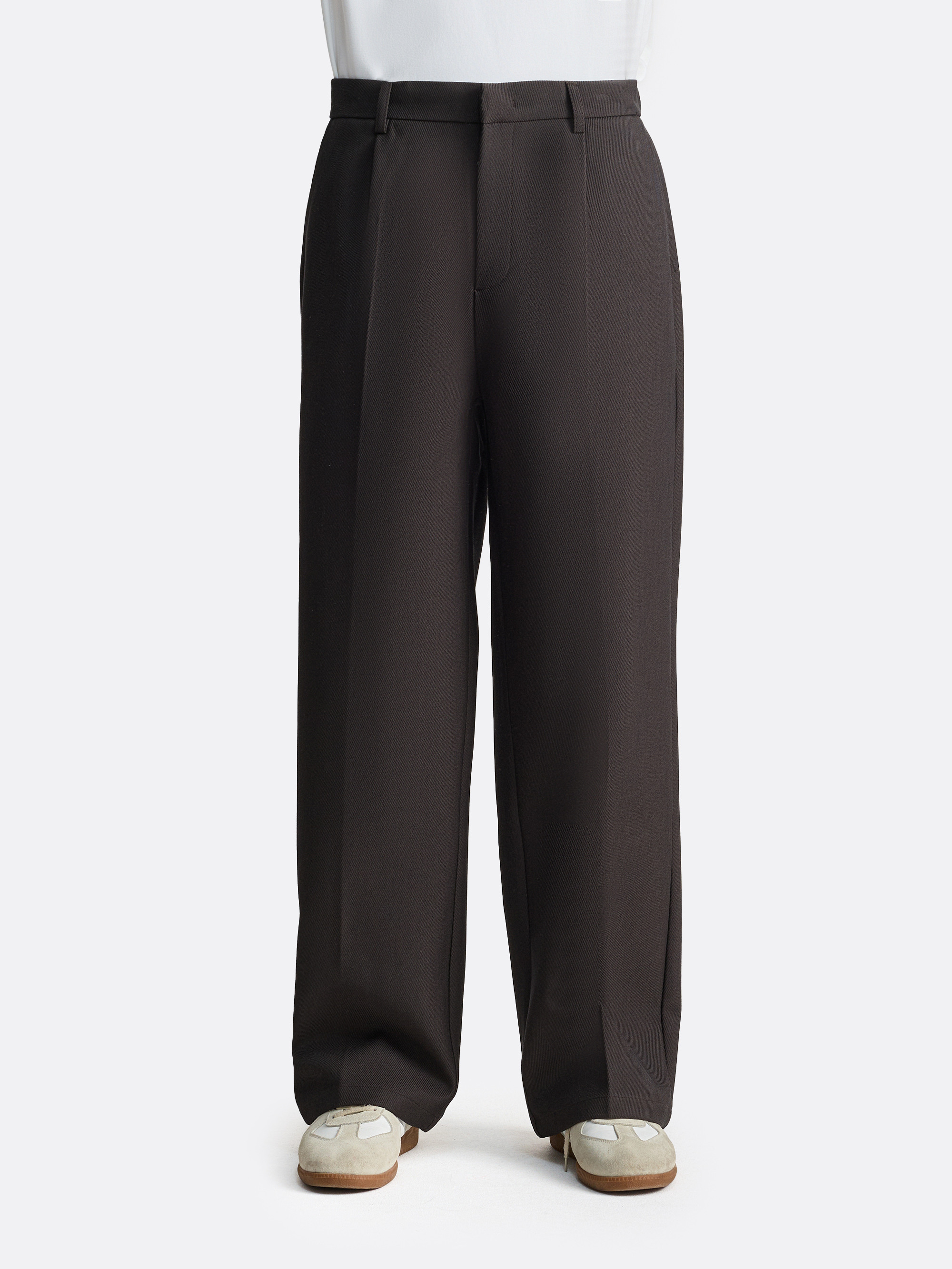 Брюки свободного силуэта с широкими прямыми штанинами и мягкой посадкой по талии. Передние защипы формируют дополнительный объём и подчёркивают вертикаль силуэта. Пояс со шлёвками фиксируется на застёжку, сохраняя аккуратную линию верха.