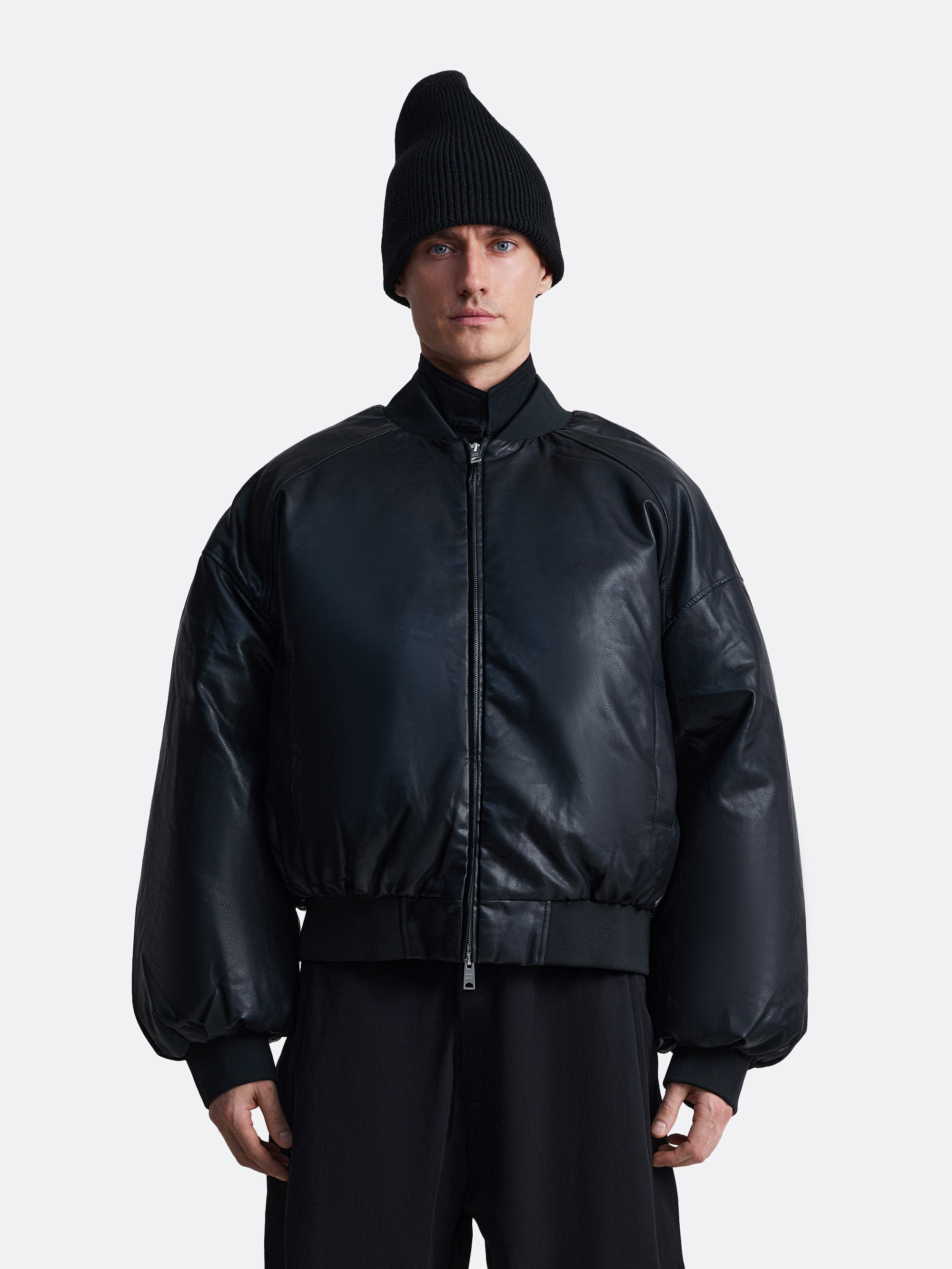 Объёмный бомбер из гладкой экокожи с глубоким оттенком и фактурным отливом. Укороченный крой и мягкий блеск поверхности подчёркивают мощный силуэт — плотные рукава, широкая посадка, акцент на плечи. Эластичные манжеты и низ на резинке контрастируют с массивной формой, а воротник стойка выполнен из плотной рибаны. Двухзамковая молния и тёплая подкладка делают модель удобной для зимы.