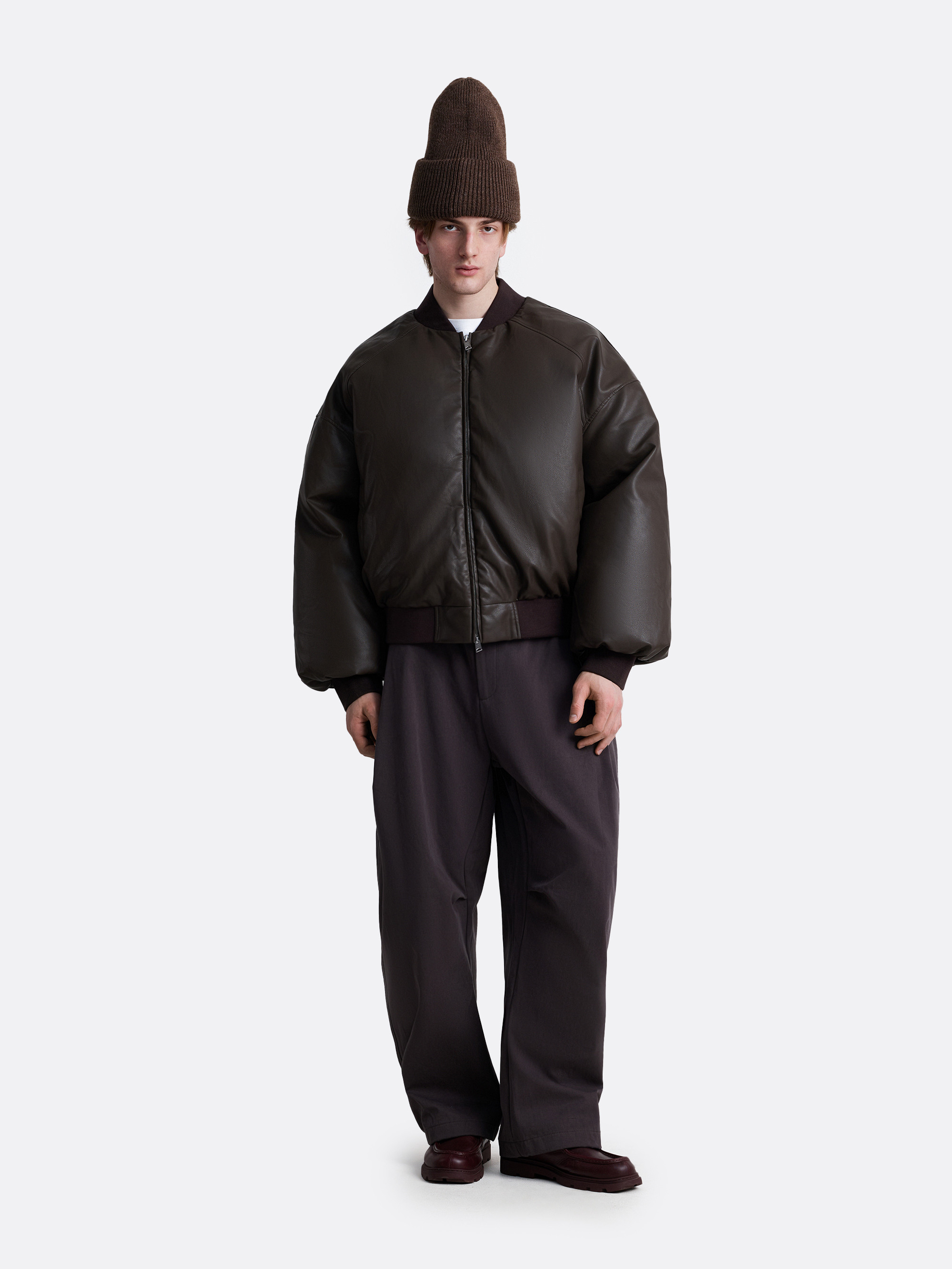 Объёмный бомбер из гладкой экокожи с глубоким оттенком и фактурным отливом. Укороченный крой и мягкий блеск поверхности подчёркивают мощный силуэт — плотные рукава, широкая посадка, акцент на плечи. Эластичные манжеты и низ на резинке контрастируют с массивной формой, а воротник стойка выполнен из плотной рибаны. Двухзамковая молния и тёплая подкладка делают модель удобной для зимы.