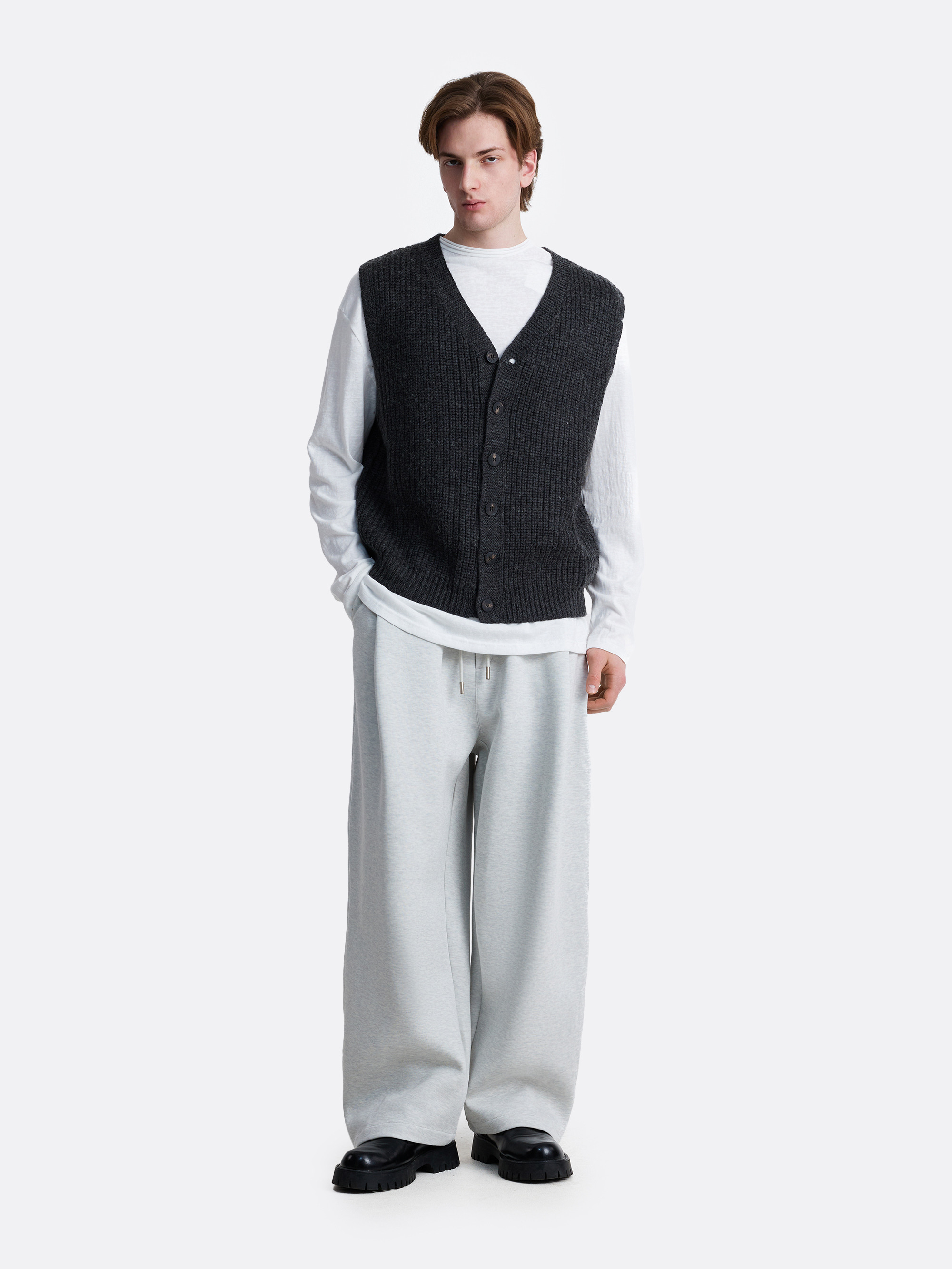 Объёмная вязаная жилетка с крупной фактурной петлей. Акцент на плотную вертикаль вязки, деревянные пуговицы и слегка удлинённый силуэт. Материал на основе шерсти мягкий и упругий — держит форму, но не лишён пластики.