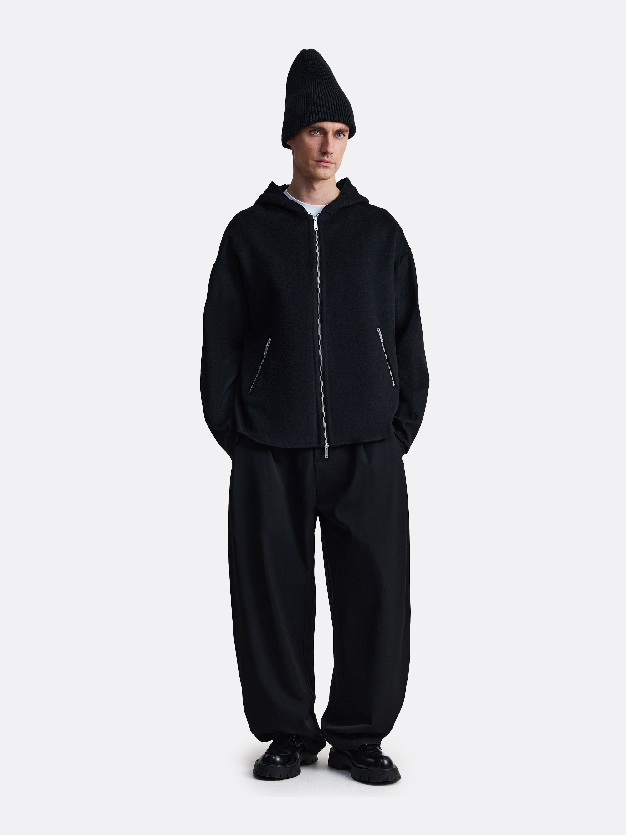 Шерстяное зип-худи с капюшоном из плотного польтового ворсистого материала с матовым финишем. Акцентные металлические молнии на карманах и центральной застёжке добавляют функциональный акцент. Свободный крой и слегка удлинённые рукава подчёркивают расслабленный силуэт.