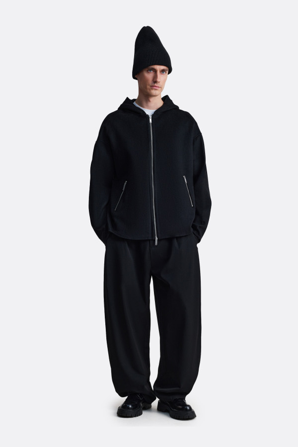 Шерстяное зип-худи с капюшоном из плотного польтового ворсистого материала с матовым финишем. Акцентные металлические молнии на карманах и центральной застёжке добавляют функциональный акцент. Свободный крой и слегка удлинённые рукава подчёркивают расслабленный силуэт.