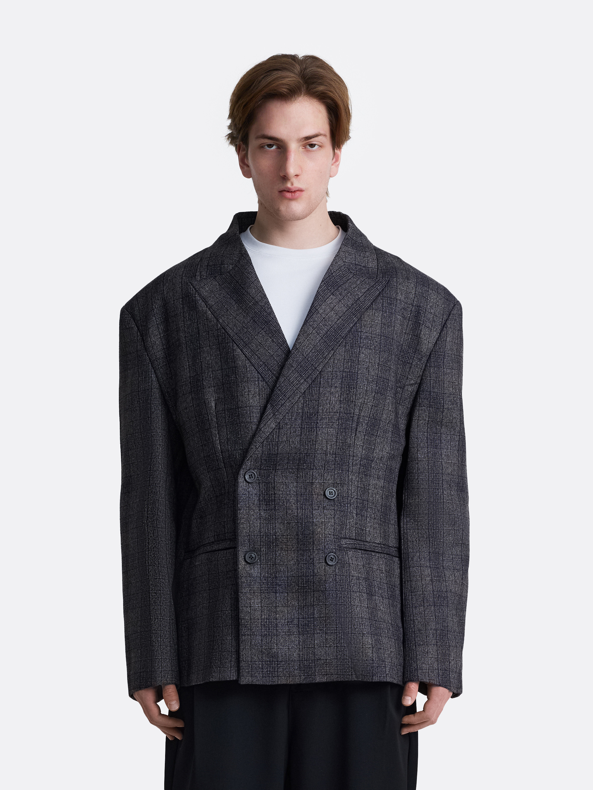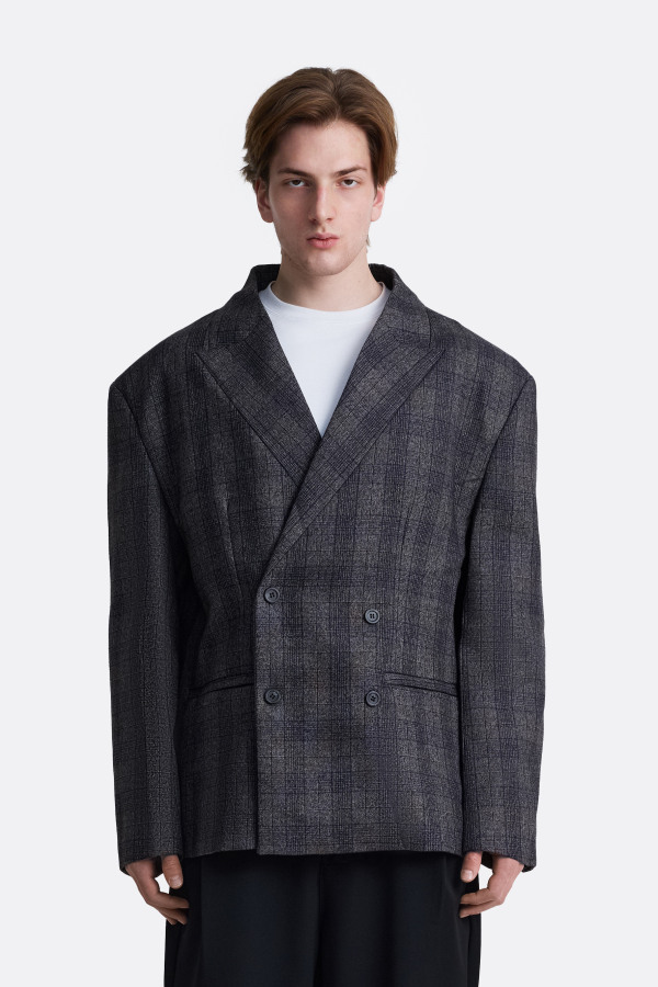 Двубортный пиджак свободного силуэта с мягко скроенной линией плеч и выразительным плетёным рисунком клетки. Фактура ткани подчёркивает глубину цвета — от графитовых тонов до тонких оливковых акцентов. Минималистичные карманы, аккуратная ширинка лацканов и расслабленная посадка создают ощущение современной классики с лёгким арт-настроением. Плотная, структурная ткань уверенно держит форму и делает пиджак самодостаточным элементом образа.
